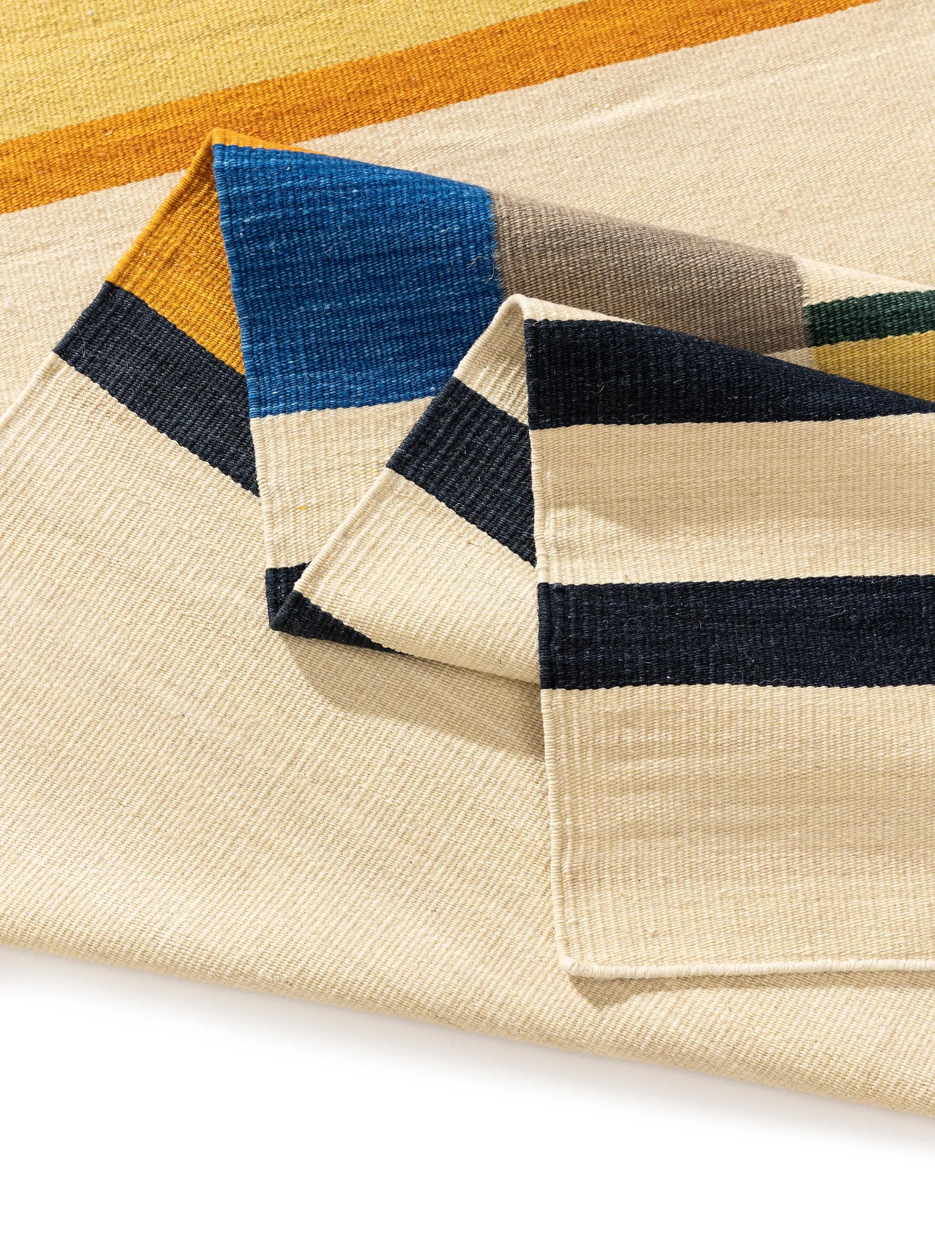 Un tapis qui invite au toucher et au regard, mêlant la géométrie kilim à une palette douce où le multicolore se pose en dialogue avec le beige. La lecture graphique multicouche s’impose dès le premier regard : motifs répétitifs et frises se superposent, lignes brisées et petites symétries irrégulières créent une lecture rythmée, comme une partition visuelle héritée de traditions réinterprétées.