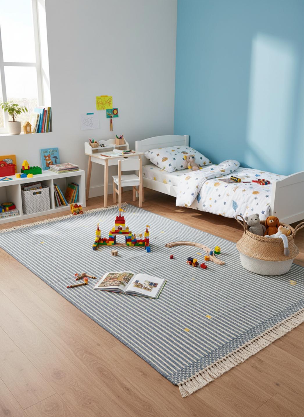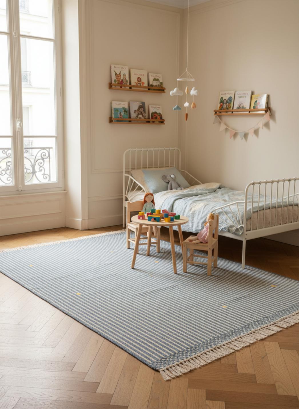 Dans les après-midis ensoleillés, il devient le théâtre des constructions et des châteaux de coussins : la surface rayé guide le regard, stabilise les déplacements et crée un espace de jeu clairement délimité. La couleur délicate bleu s'accorde naturellement avec un mobilier en bois clair et des lumières tamisées, invitant la lampe de lecture à éclairer les dessins du soir et les lectures partagées à voix basse.