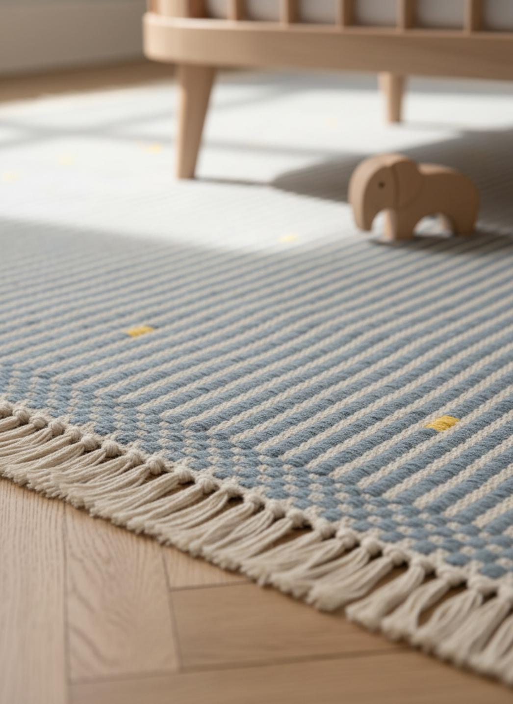 Lorsque vous déroulez ce tapis sous les pieds de votre petit, c'est toute une promesse de douceur qui s'installe dans la chambre. Le tissage inspiré du kilim apporte une texture chaleureuse et légèrement matelassée, parfaite pour les siestes improvisées et les histoires au coin du lit. Les bandes évoquent un ciel apaisant, et chaque pas se fait plus doux, plus rassurant, pour ces premiers pas hésitants et pour les jeux sur le sol.