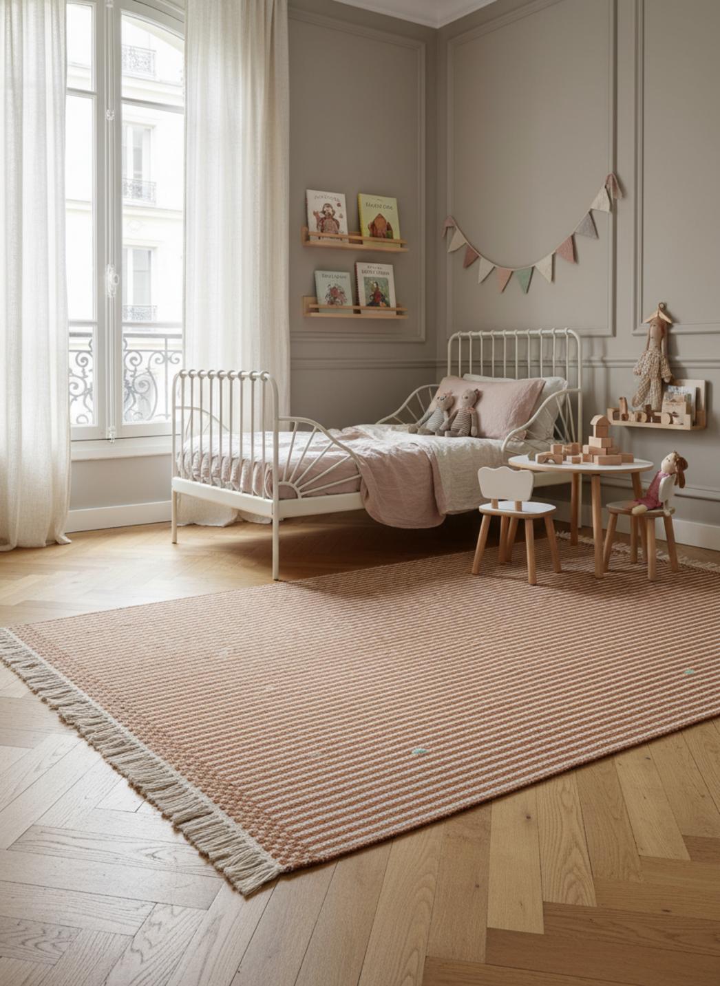 Chaque matière raconte une sensation, et le coton se distingue par son contact moelleux et respirant contre la peau. En roulant une poupée, en posant un livre ou lors des premiers pas hésitants, le toucher reste tendre, sûr et stable : un soutien discret qui rassure. La structure rayée, pensée pour durer, ajoute une allure graphique qui structure l’espace sans surcharger la décoration, et s’accorde naturellement avec une lampe douce, des coussins pastel et un mobilier en bois clair.