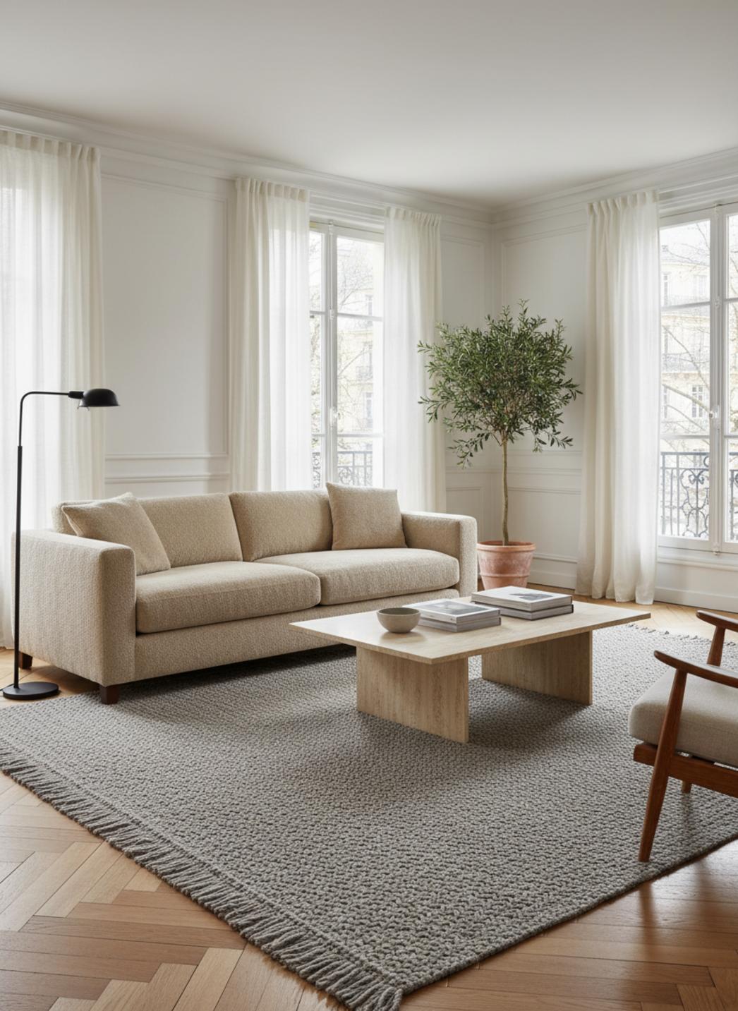 Pensé pour occuper un espace déterminé, le format 160x230 cm structure la pièce sans l'écraser. Il allie présence et légèreté, capable de délimiter un salon, d'encadrer un coin lecture ou de poser une assise visuelle sous une table basse. Sa proportion favorise l'équilibre entre mobilier et sol, guidant le regard sans imposer ni cloisonner.