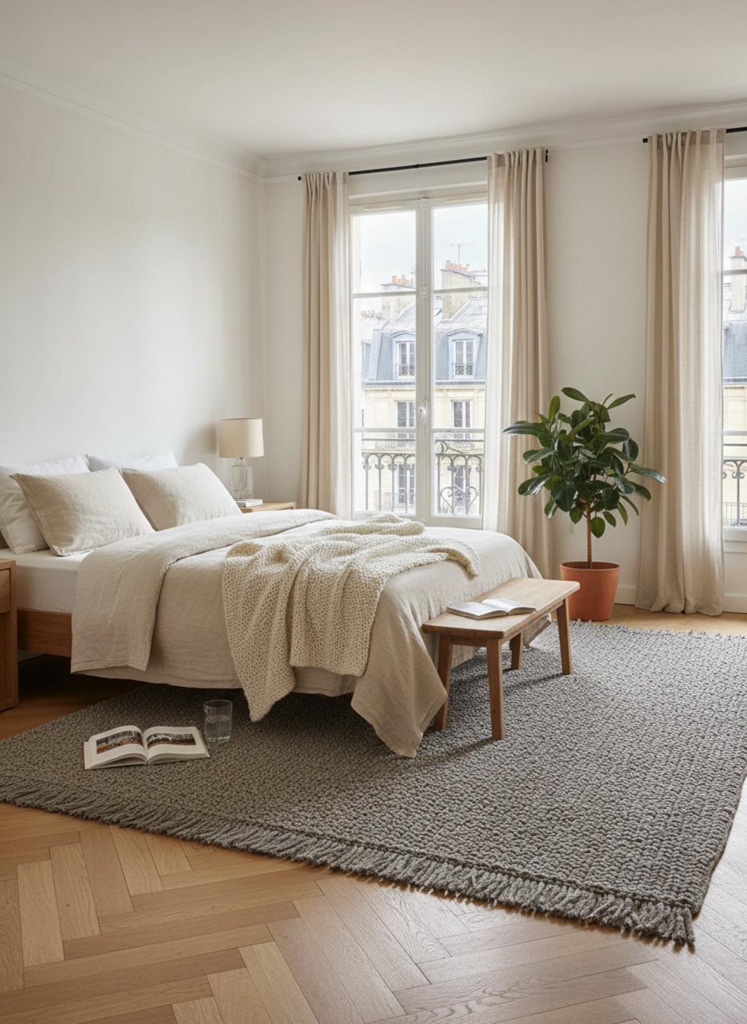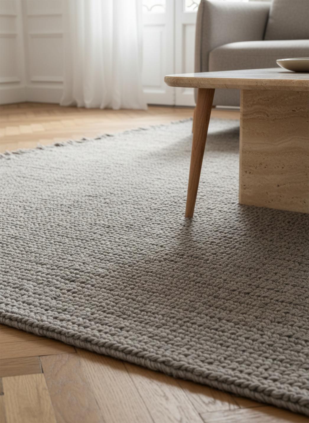 Idéal pour superposer, tempérer une surface en bois ou adoucir un sol carrelé, ce tapis en nuances gris se marie aux matières naturelles et aux textiles lin, apportant une trame discrète mais structurante. La lecture graphique multicouche invite au calme ; la chaleur visuelle provient autant des motifs que de l'effet tissé, créant une atmosphère à la fois artisanale et raffinée.
