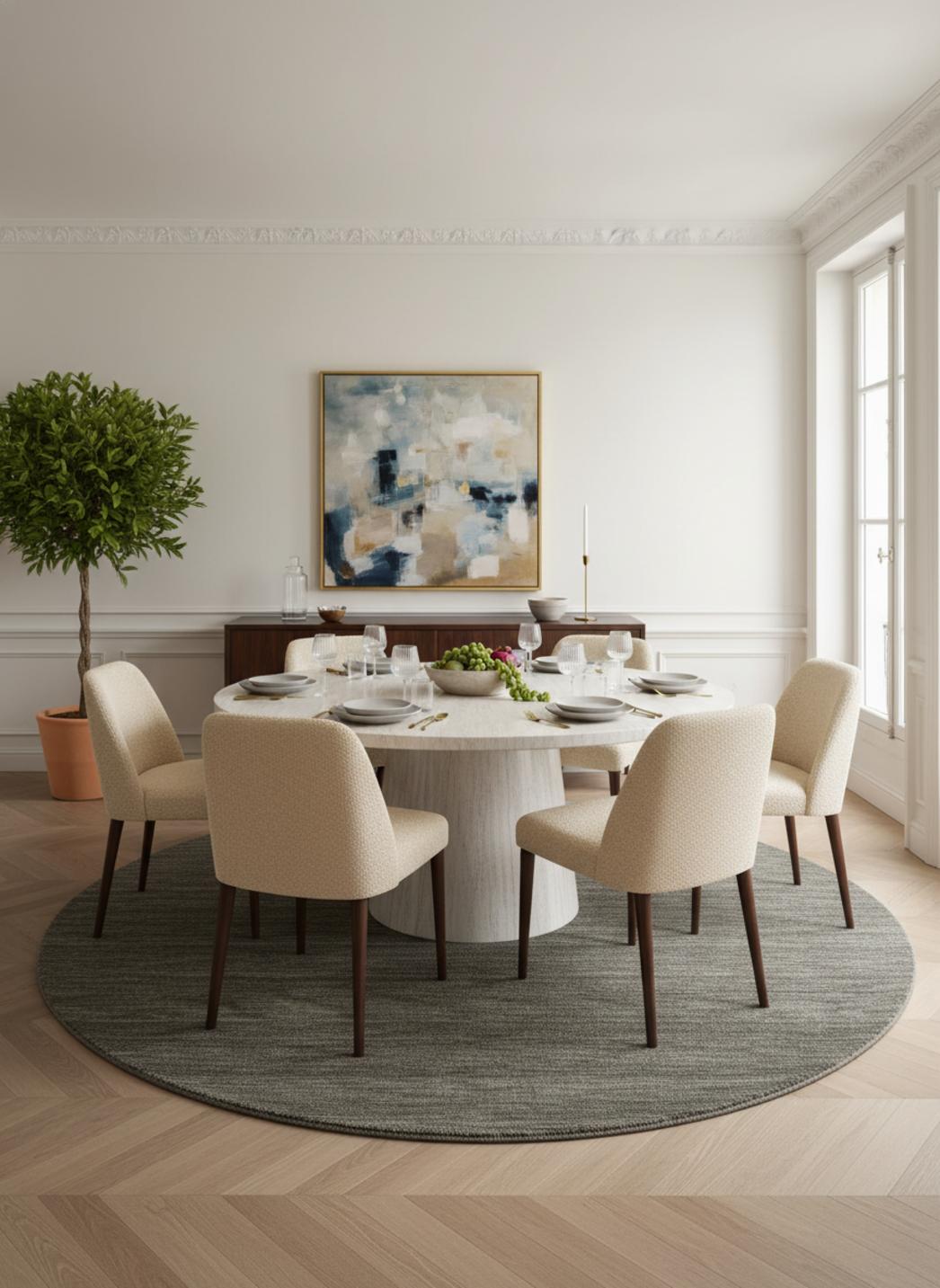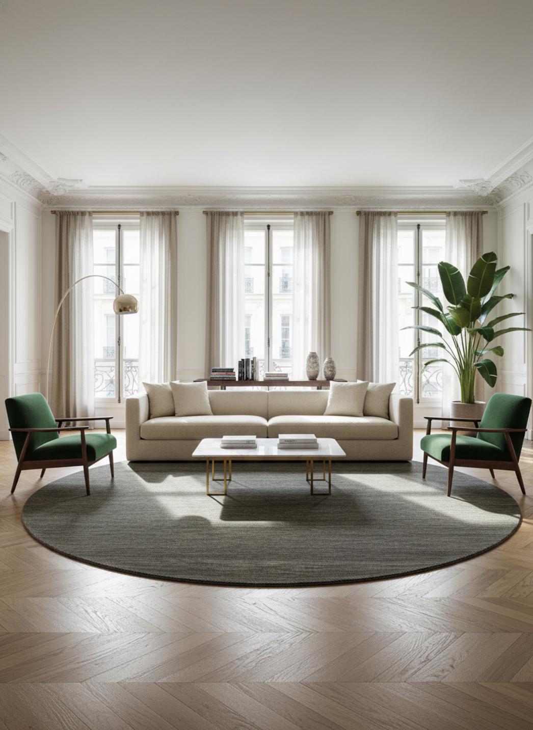 Avec sa forme rond et un diamètre de 200 cm, il devient un point focal qui adoucit les angles du mobilier contemporain. Posé sous une table basse ou au cœur d’un coin lecture, il définit une zone de vie, invite à la conversation et structure l’agencement sans surcharger. Son format circulaire instaure un équilibre graphique qui complète les lignes rectilignes d’un canapé moderne.