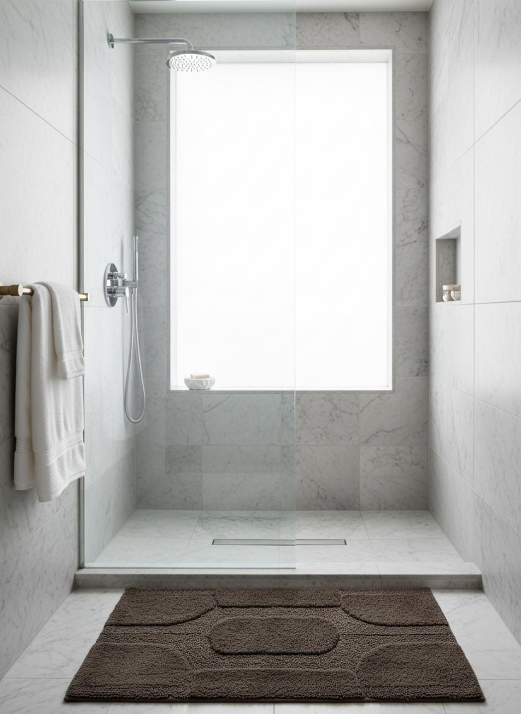 Pensé pour définir un fragment d'espace, le format 50x80 cm se place naturellement devant une vasque, une baignoire posée au sol ou une sortie de douche, structurant la zone tout en gardant une allure légère et proportionnée qui respecte l'esthétique de la pièce.