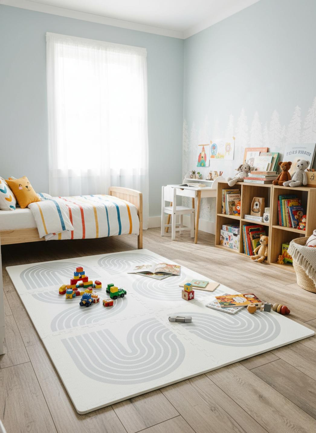Son format pensé pour la chambre — généreux sans être envahissant — accueille les jeux en groupe, les lectures à deux et les siestes partagées. Le motif type puzzle apporte une touche ludique et facilite l’intégration visuelle au mobilier: étagères basses, lampe douce et petite table d’activités s’accordent autour d’un sol qui rassure et inspire.