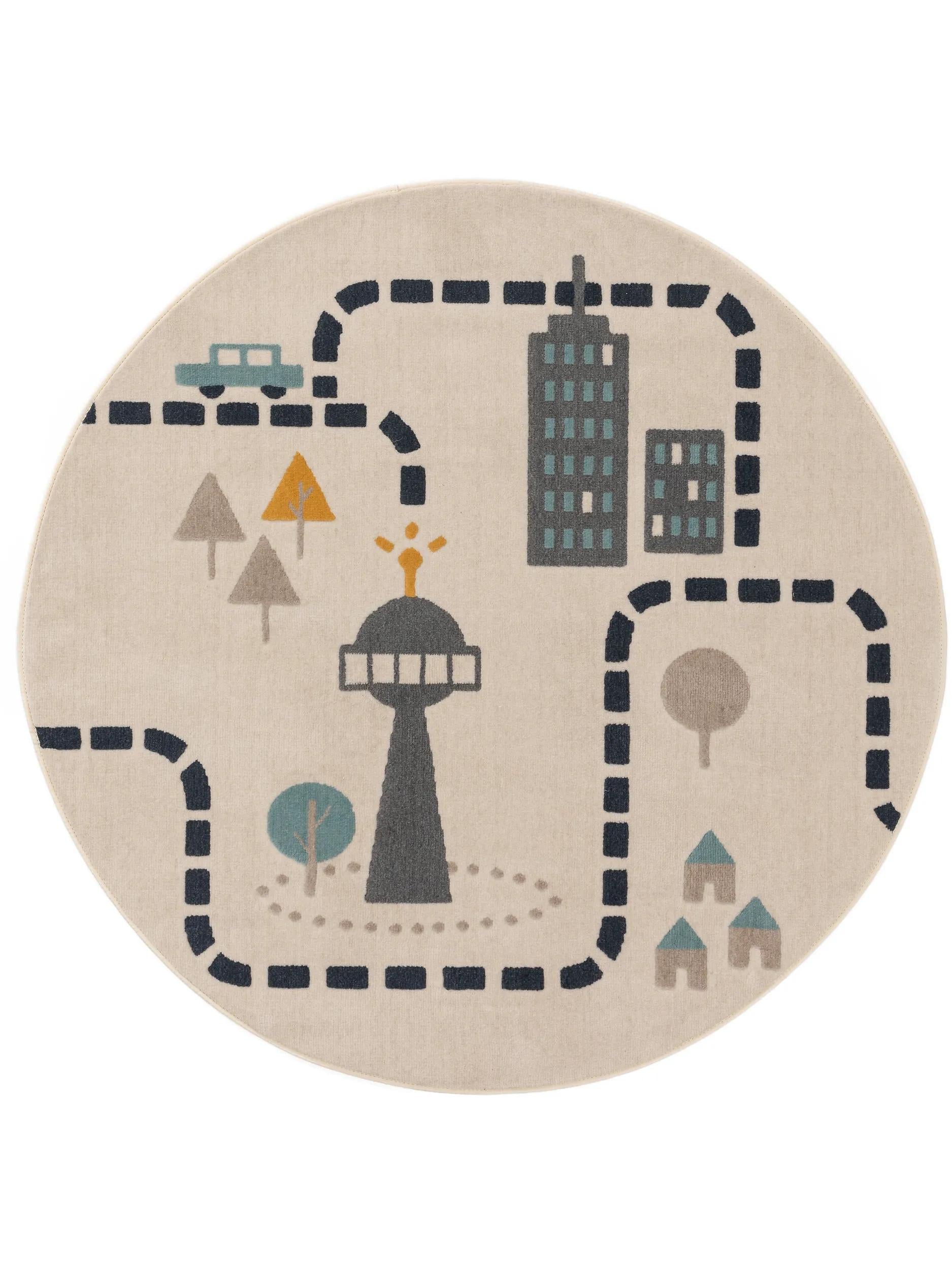 Tapis moderne dessin de ville rond enfant beige 120 cm de diamètre