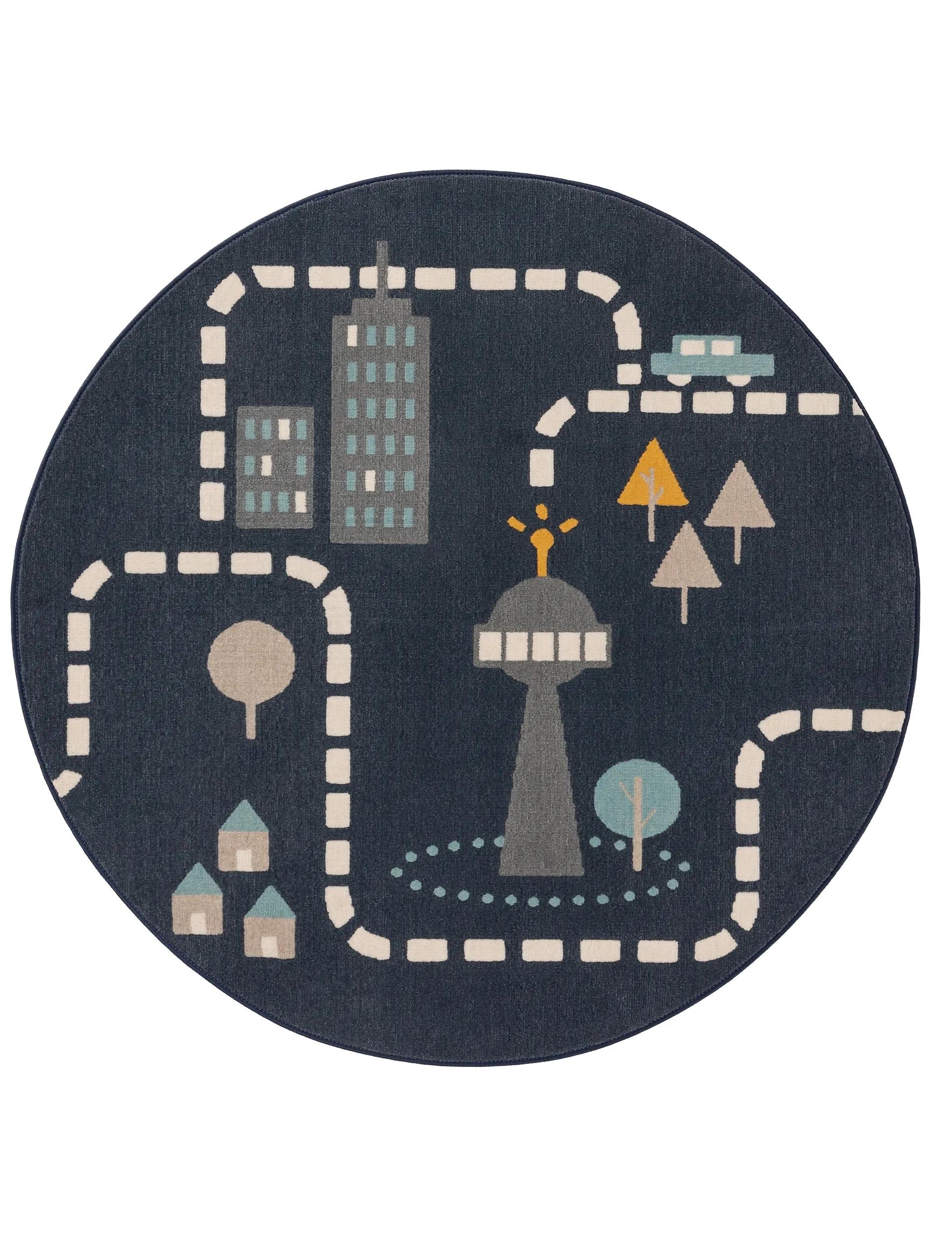 Tapis moderne dessin de ville rond enfant bleu 120 cm de diamètre