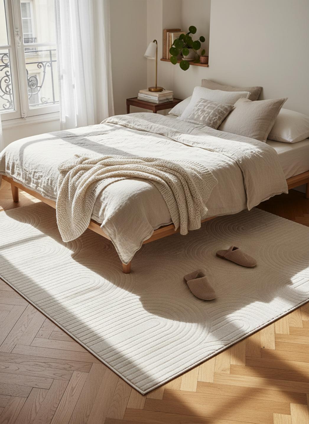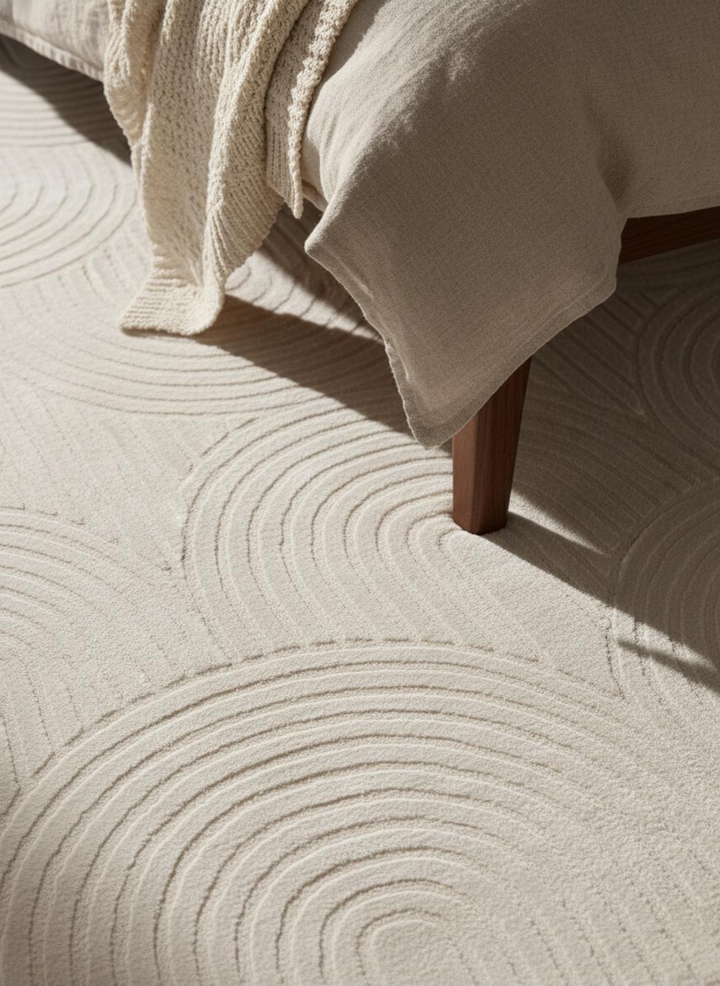 Sous une présence discrète mais affirmée, le tapis construit un jeu de volumes en jouant sur un relief délicat où les courbes dessinent des chemins de lumière. La surface invite le regard à glisser, les lignes arrondies apportent une respiration douce dans un intérieur aux volumes nets.