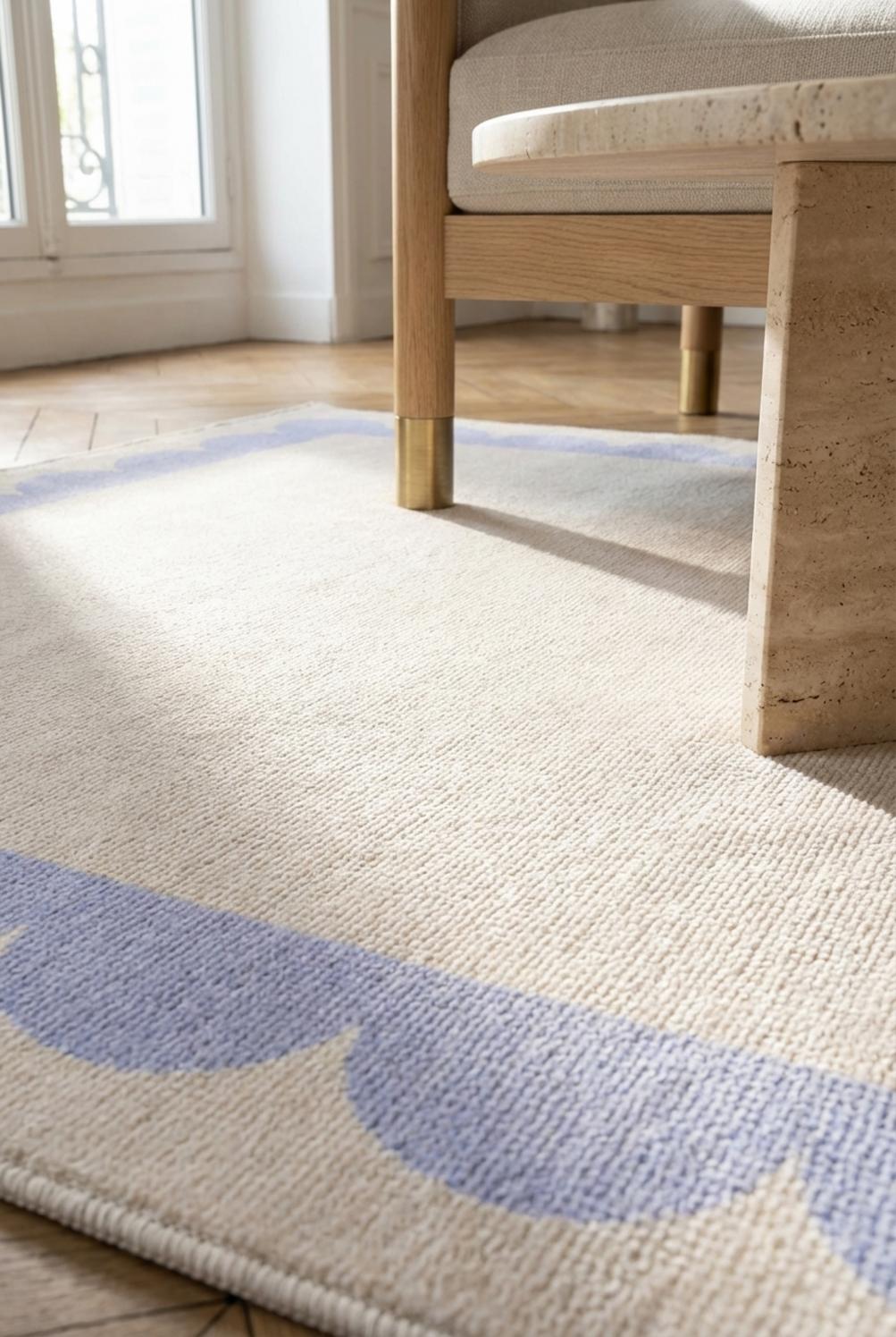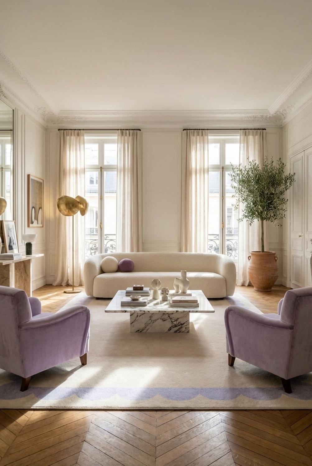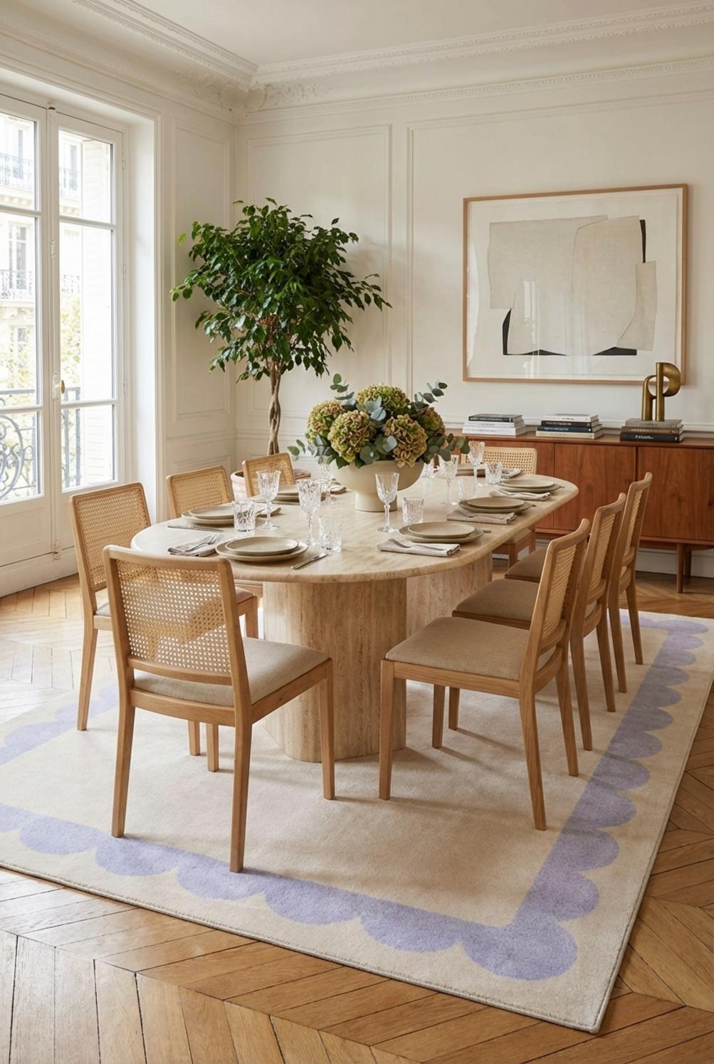 Ce tapis sait valoriser les matériaux et les couleurs du mobilier : bois clair, laques mates et métaux brossés trouvent ici un interlocuteur qui les met en valeur sans les concurrencer. La lumière naturelle y danse plus librement, soulignant les nuances de beige et réveillant les accents de violet dans une atmosphère chaleureuse et contemporaine.