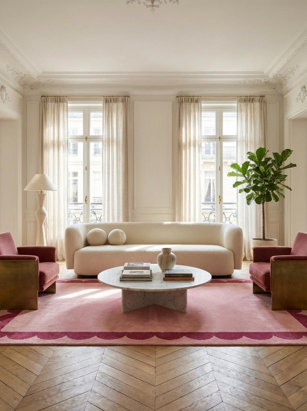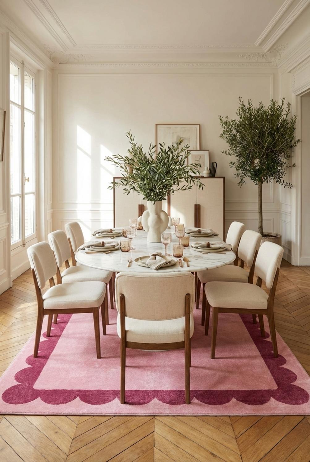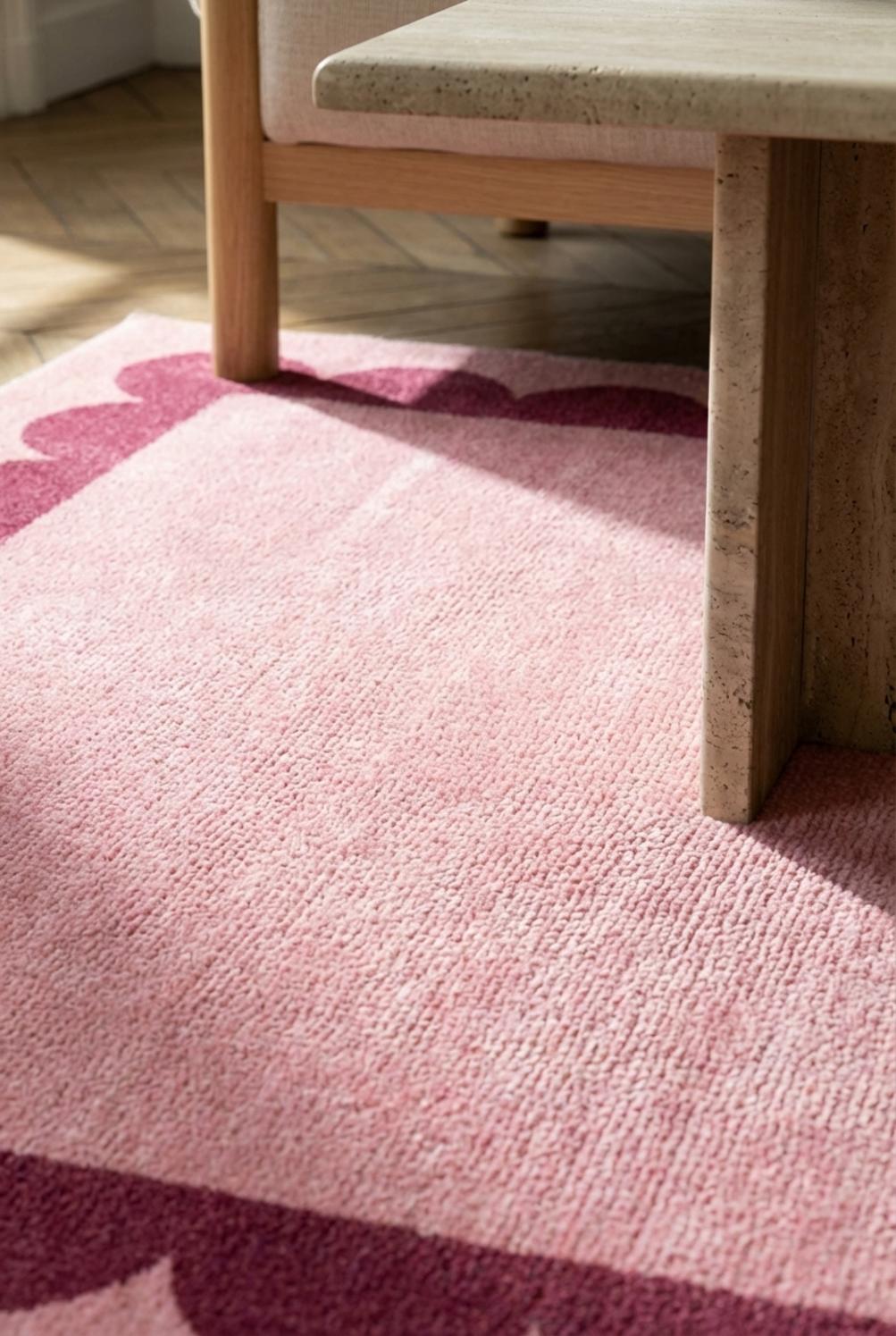 La palette privilégie une douceur contrastée où les notes de rose se mêlent à des accents de fushia, créant un jeu chromatique à la fois chaleureux et affirmé. Les teintes dialoguent délicatement avec la lumière ambiante, apportant une vibration discrète qui réchauffe un salon lumineux ou dynamise une chambre aux lignes épurées sans rompre l’harmonie générale.