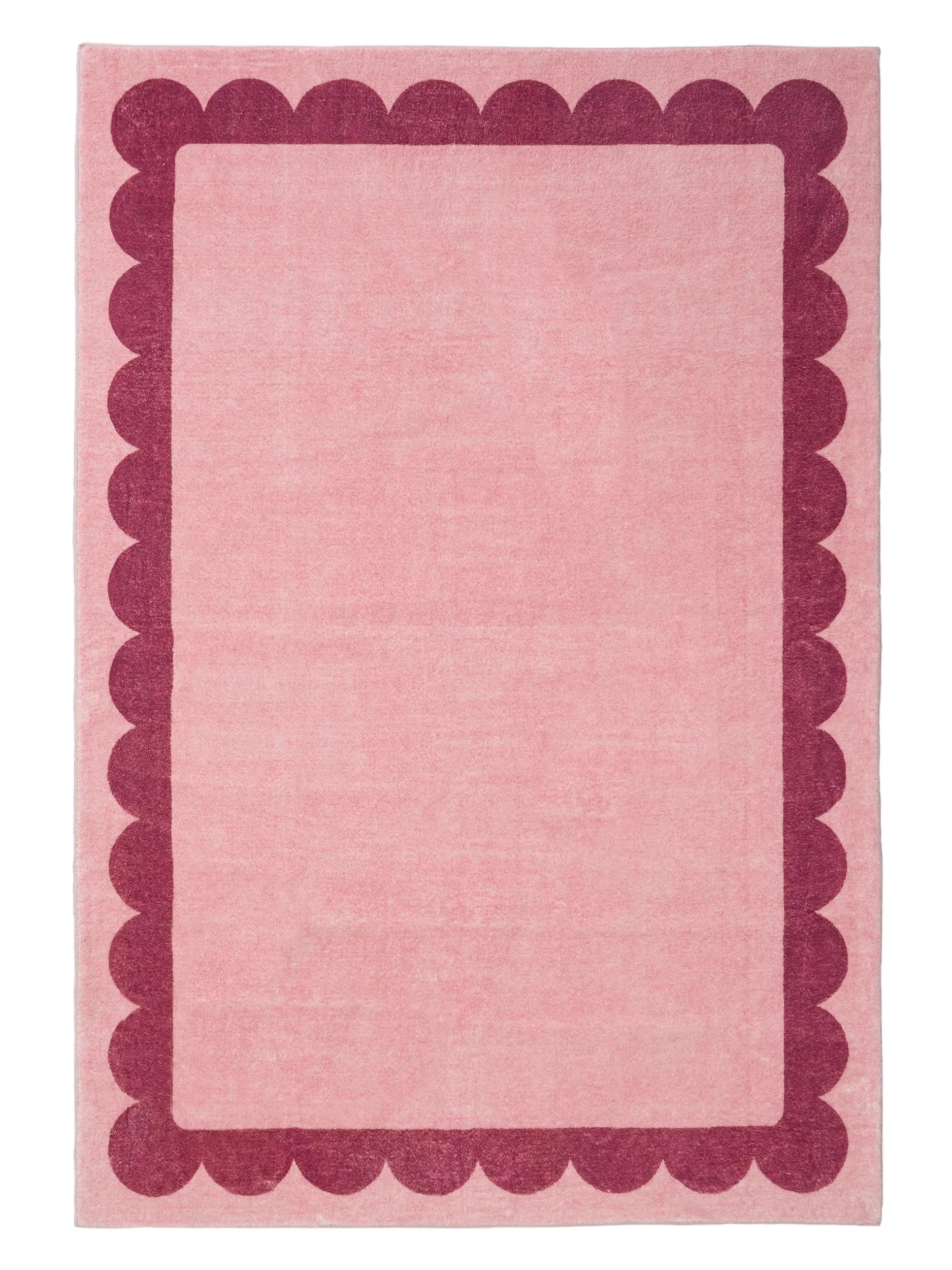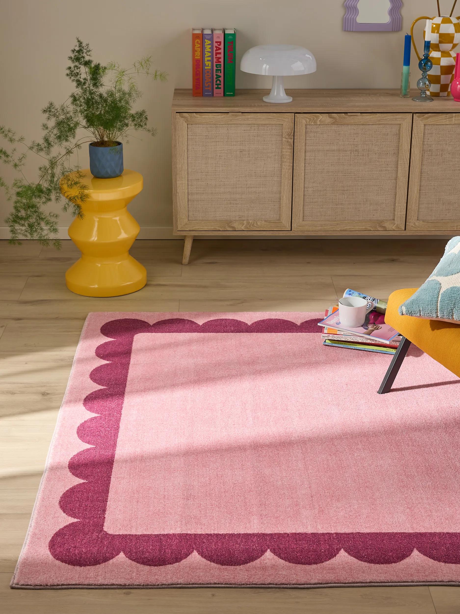Les ambiances se créent en douceur : ce tapis devient point focal dans un salon minimaliste, nuance chaleureuse dans une chambre neutre ou accent contemporain dans un bureau épuré. Les murs clairs, un fauteuil en velours et un luminaire discret suffisent à valoriser la force chromatique du rose et du fushia, tandis que le motif d’encadrement apporte une structure visuelle qui calme le regard.