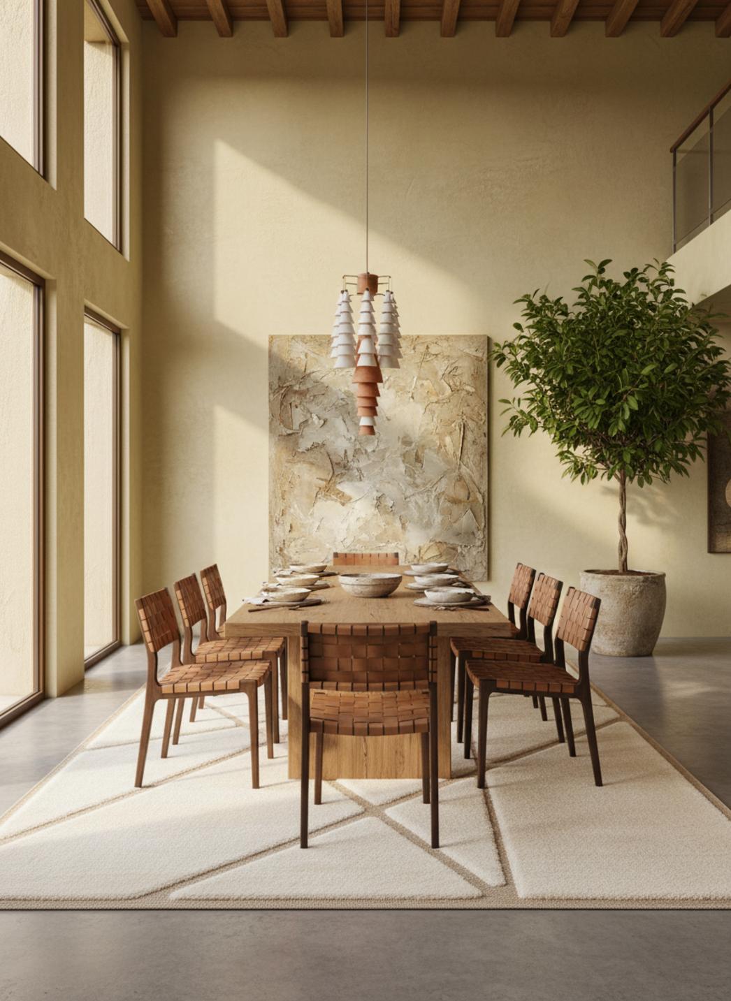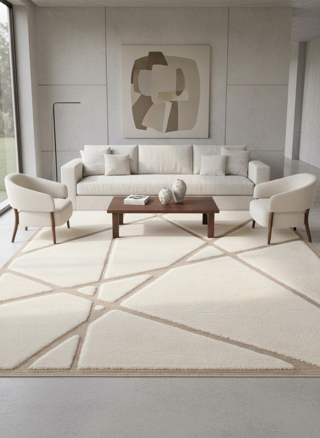 Sa présence se marie naturellement avec un mobilier contemporain : bois clair, métal brossé et matières naturelles trouvent un appui harmonieux dans ce tapis lumineux. La nuance claire amplifie la lumière, tandis que les textures subtiles ajoutent de la profondeur sans complexité. L’ensemble restitue une atmosphère premium accessible, où chaque élément respire et compose un équilibre serein.