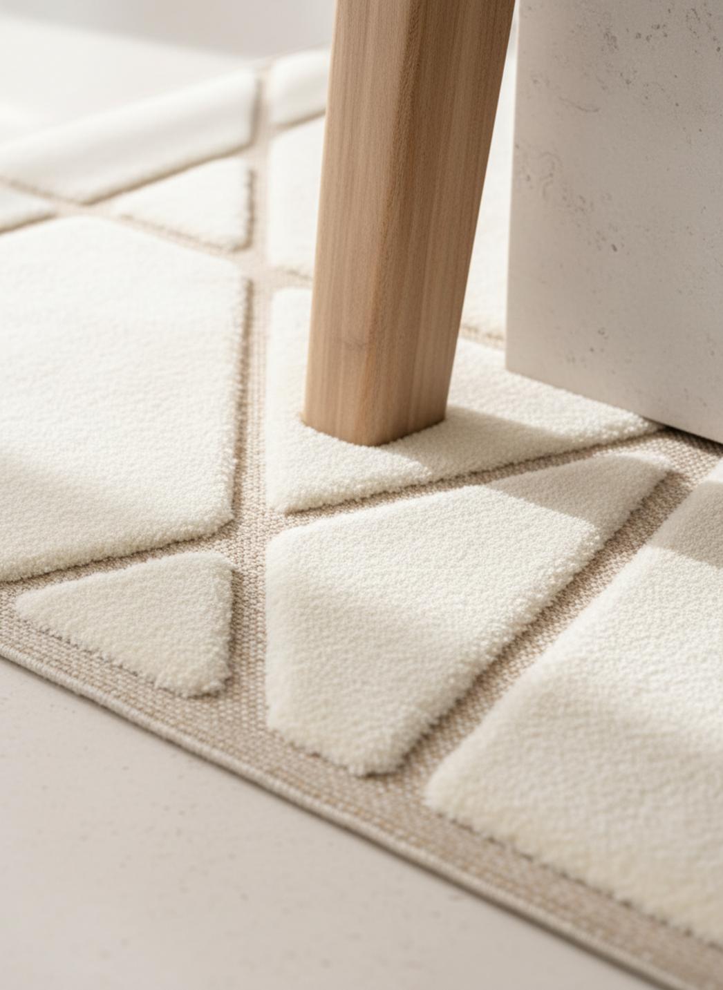Un geste graphique et apaisant habille le sol, où la simplicité trouve une présence discrète et affirmée. Le dessin respire dans une palette dominée par le blanc, tandis que l’esprit moderne s’exprime par des surfaces épurées et des contrastes délicats. L’ensemble invite au calme visuel : une pièce qui gagne en lumière sans perdre en caractère, un compagnon discret pour un intérieur contemporain.