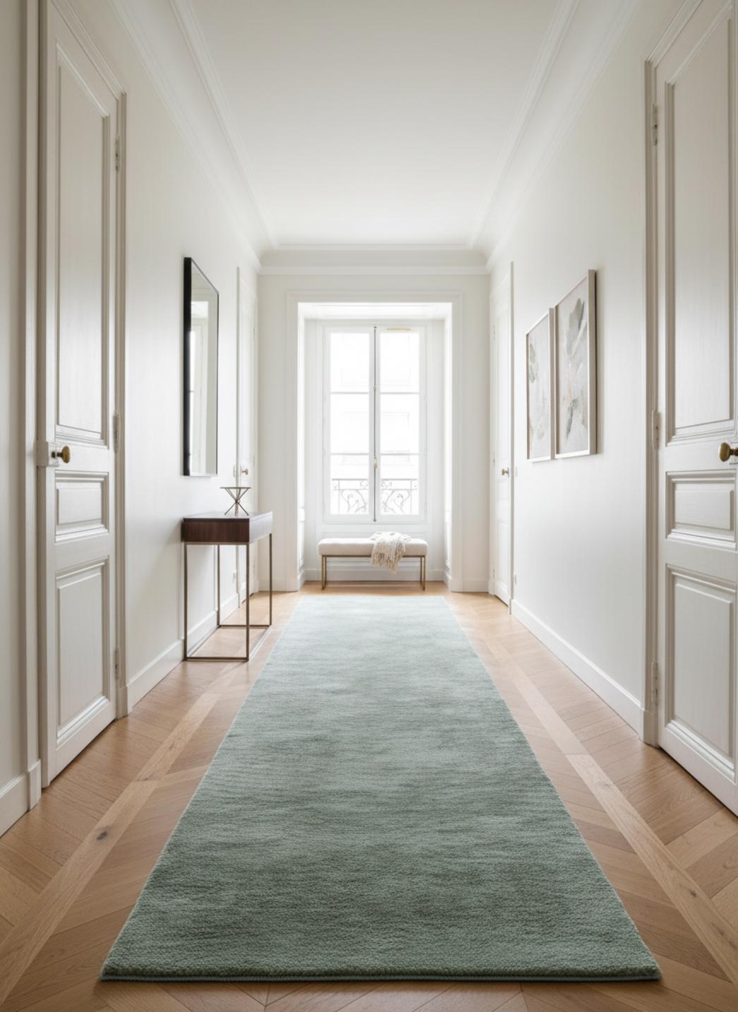 Conçue pour habiller une transition, la pièce est parfaitement adaptée à l’espace de circulation : le format 80x300 cm structure le parcours et guide le regard, transformant un simple couloir en un corridor de confort. Le couloir gagne en perspective et en caractère, comme si le tapis dessinait une entrée signée et chaleureuse, sans rompre la fluidité du design intérieur.