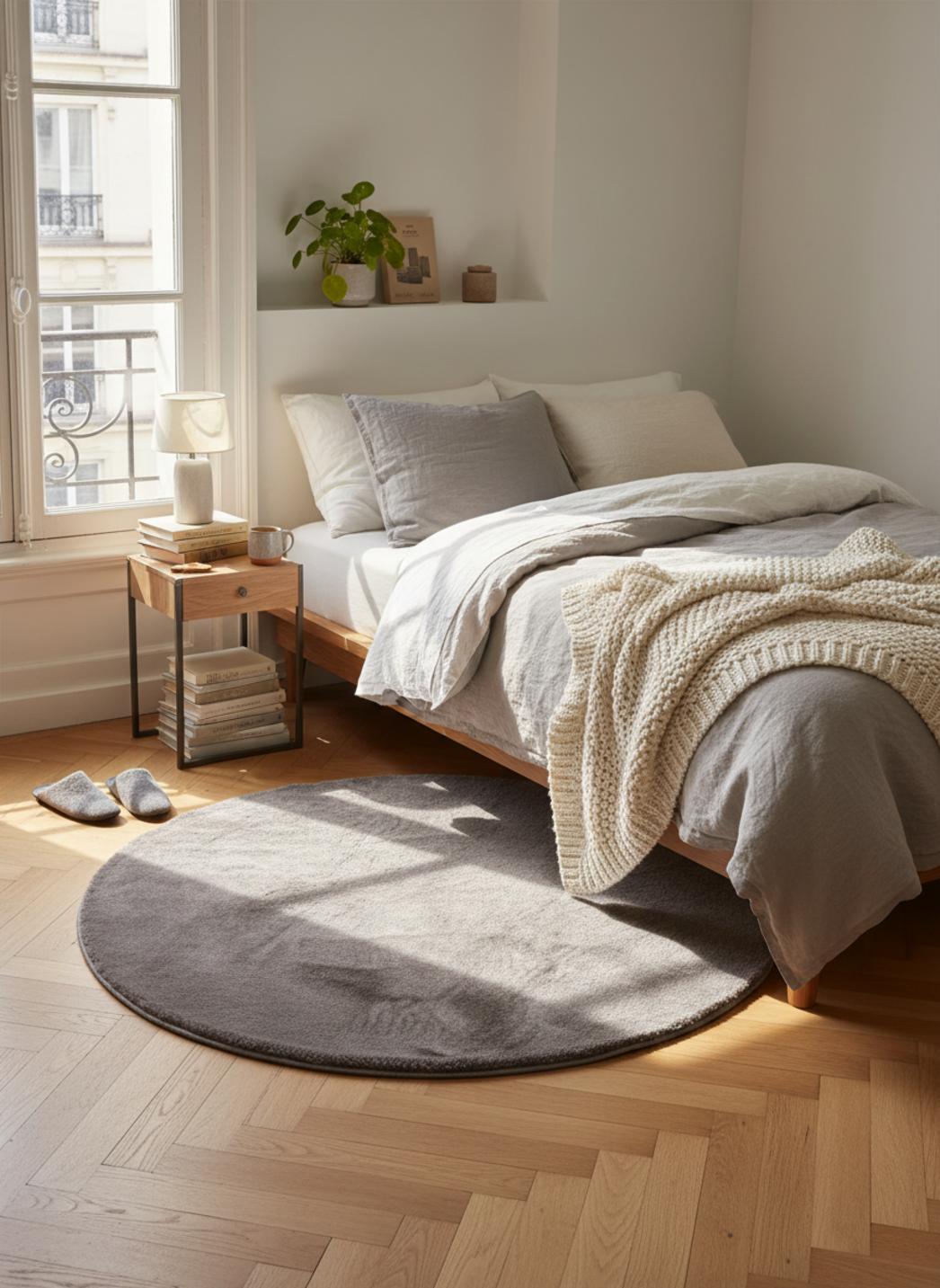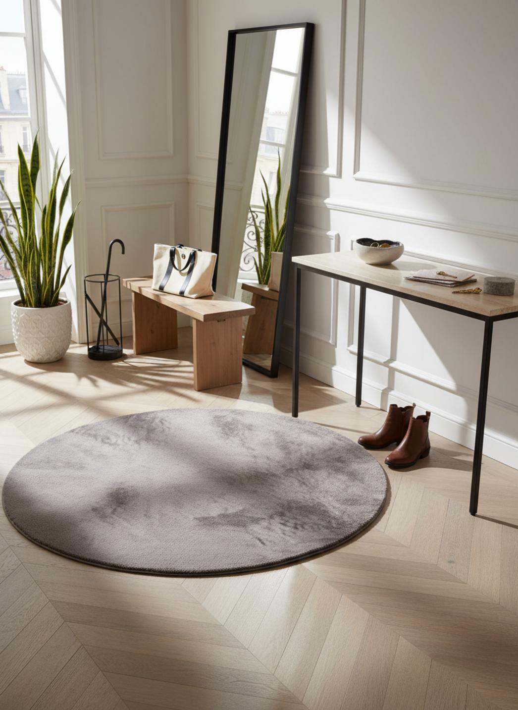 Sa silhouette circulaire invite au centrage d’un fauteuil, d’une lampe ou d’un petit plateau, définissant un foyer visuel à la fois doux et affirmé. La forme rond renforce la sensation d’enveloppement et gomme les angles, apportant une respiration apaisante au décor. En jouant sur les volumes, ce tapis devient un élément de composition qui valorise le mobilier contemporain sans rivaliser avec lui.