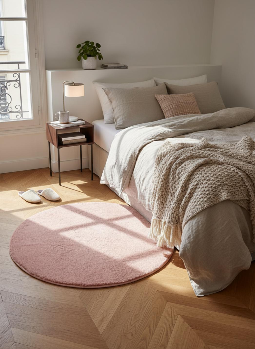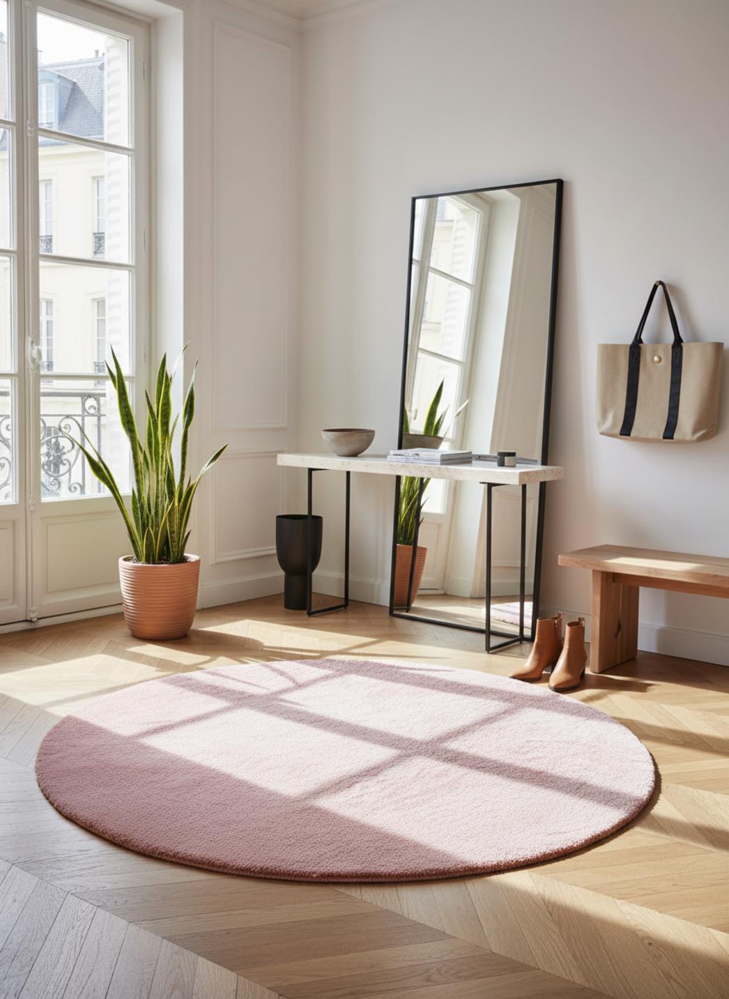 Autour d'un coin lecture ou d'un fauteuil design, la forme affirme son rôle avec discrétion. Le format rond trouve naturellement sa place comme point focal apaisant et centrant, et ses proportions de 80 cm de diamètre en font un élément idéal pour délimiter un espace sans alourdir la pièce. Posé devant une console, au pied du lit ou en îlot sous une lampe, il structure l'espace avec douceur et équilibre.