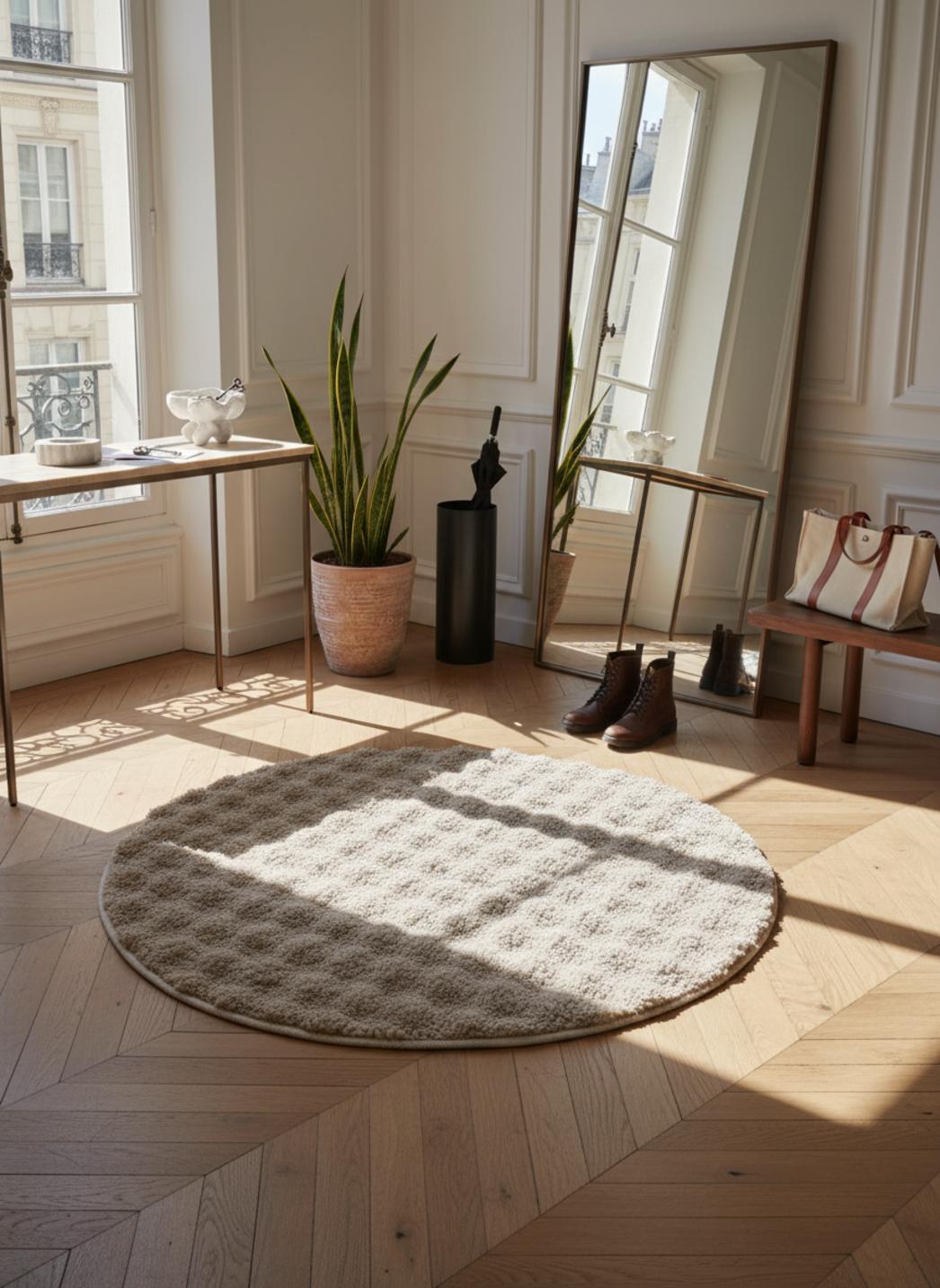 La mise en scène prend forme autour d’un diamètre précis, pensé pour s’intégrer avec justesse. En version 80 cm de diamètre, il trouve sa place au pied d’un lit, sous une coiffeuse ou en tapis d’appoint dans une entrée intimiste. Ce dimensionnement souligne la modularité, offrant une présence qui structure sans encombrer.