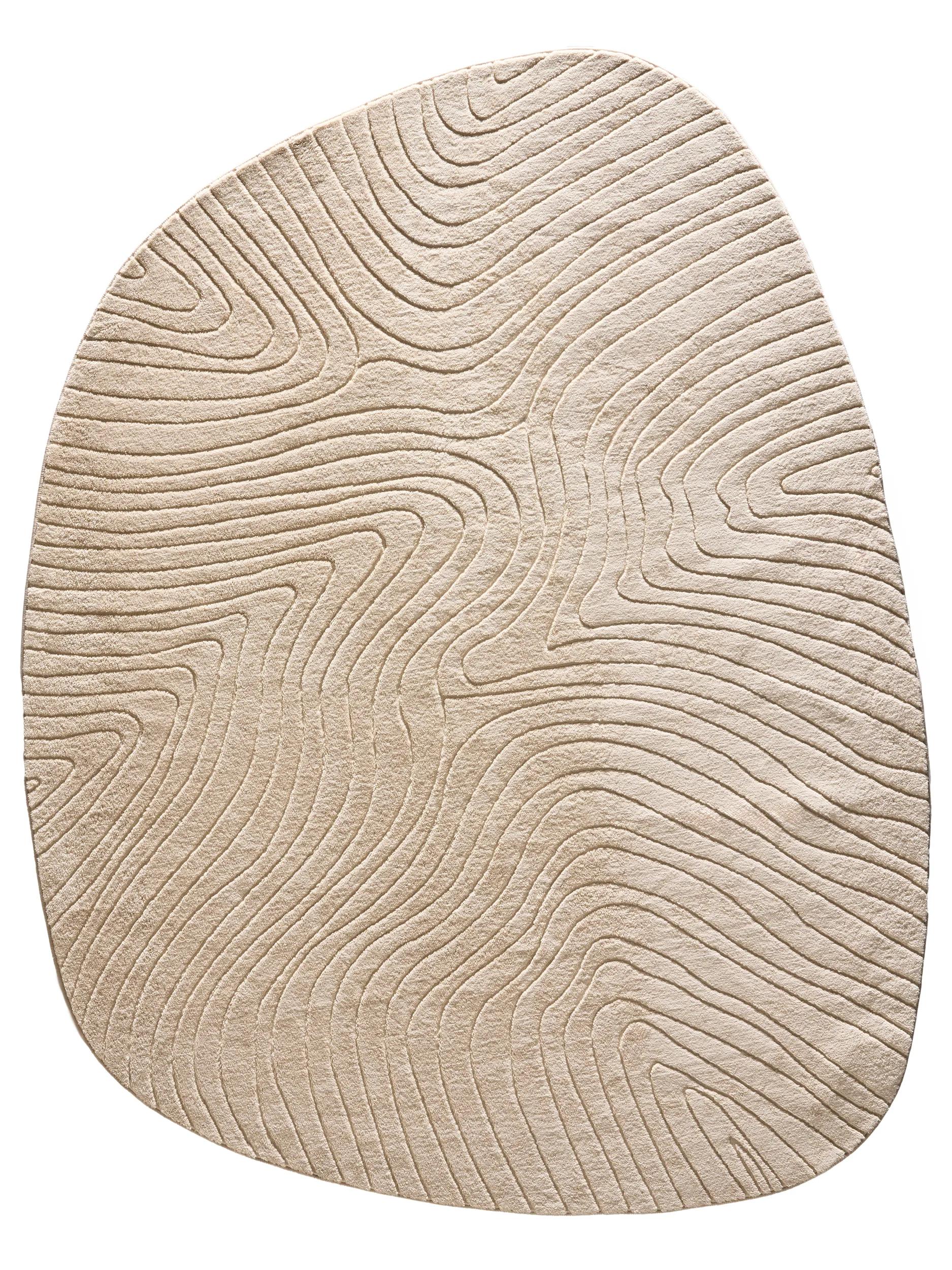 Sous l’éclairage, les contrastes doux révèlent des reliefs subtils et des transitions de tons qui animent le sol sans le dominer. Le dessin fonctionne comme une scénographie pour la pièce, orientant la circulation et créant un effet cocon dans les coins repos grâce à la douceur du beige et au vocabulaire formel du motif.
