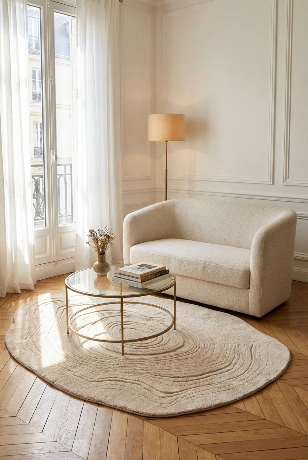 Sa silhouette ovale adoucit les lignes du mobilier et propose un point d’ancrage doux, presque cocon, qui recentre le regard et invite à la circulation autour d’un canapé ou d’une table basse.
