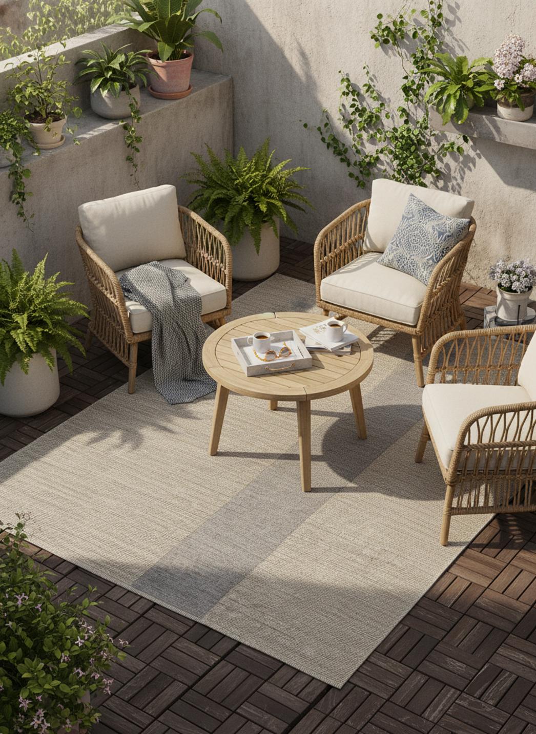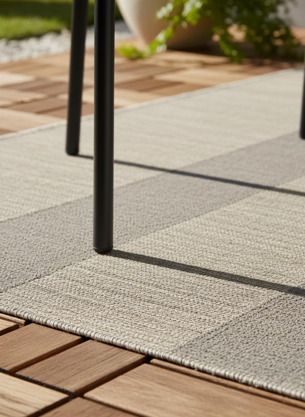Dans un coin de terrasse ou sur un balcon ensoleillé, ce tapis moderne gris et beige apporte une touche de sobriété élégante à l’espace extérieur. Ses nuances douces se fondent naturellement dans leur environnement, jouant sur l’équilibre entre la clarté apaisante du beige et la profondeur discrète du gris. Ce duo de couleurs crée une atmosphère calme et raffinée, idéale pour structurer un petit coin repas, une assise de détente ou un passage extérieur. Par son format 100x150 cm, il s’intègre avec aisance dans les espaces plus compacts tout en leur donnant une impression de cohérence et de confort visuel. Le motif, subtilement tissé, capte la lumière sans éclat excessif, révélant un relief léger qui anime la surface avec justesse. Ce tapis gris et beige incarne un style épuré et intemporel, parfait pour les extérieurs où la simplicité se marie à la douceur des teintes naturelles. Il transforme les lieux du quotidien en espaces paisibles et harmonieux, où chaque détail évoque la sérénité et le plaisir discret de vivre dehors.