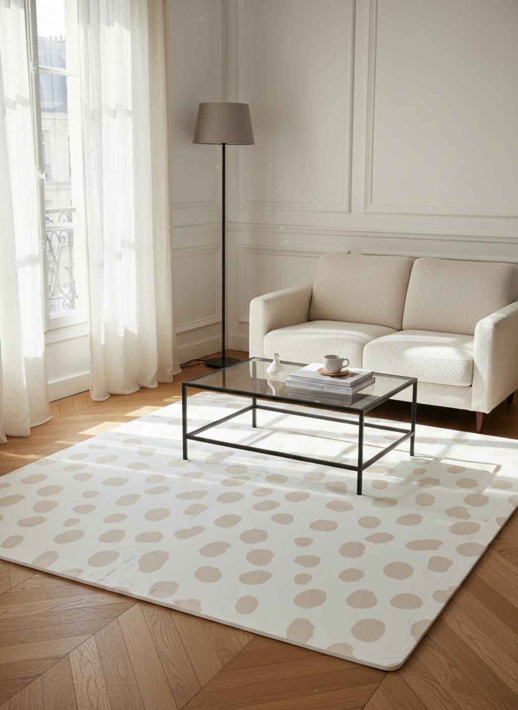 En situation, ce tapis apporte une note de cohérence contemporaine : il valorise des canapés aux lignes claires, réchauffe des sols minimalistes et crée un socle pour des accessoires choisis. Sa présence transforme une pièce en un ensemble harmonieux, où chaque élément trouve sa place dans un dialogue calme et maîtrisé.