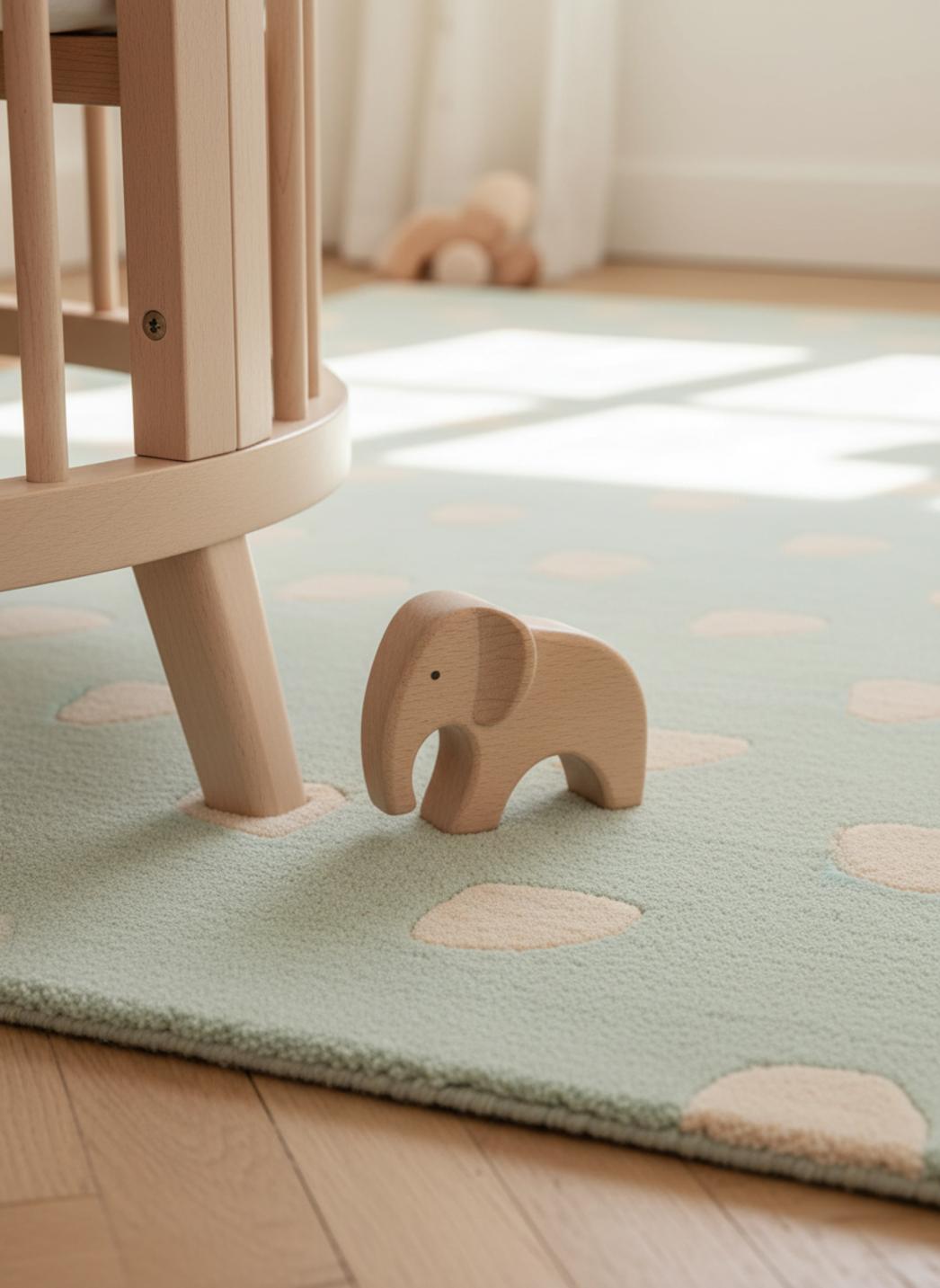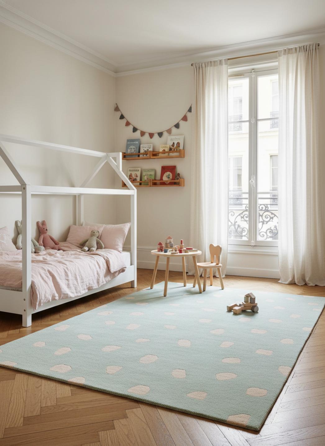 Adossé à un mur peint en tons doux, ce tapis en vert menthe crée une atmosphère apaisante, idéale pour calmer les pleurs nocturnes et favoriser les moments câlins. Sa teinte moderne s’intègre aux accessoires pastel et aux textures naturelles, renforçant l’idée d’un cocon familial où la chambre devient un refuge sensoriel, lumineux et chaleureux.
