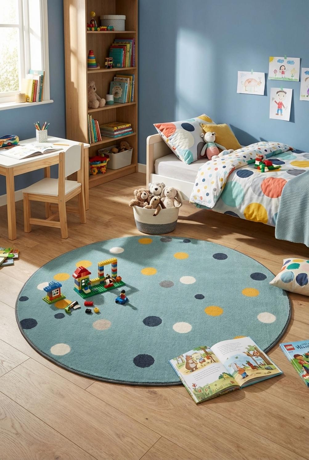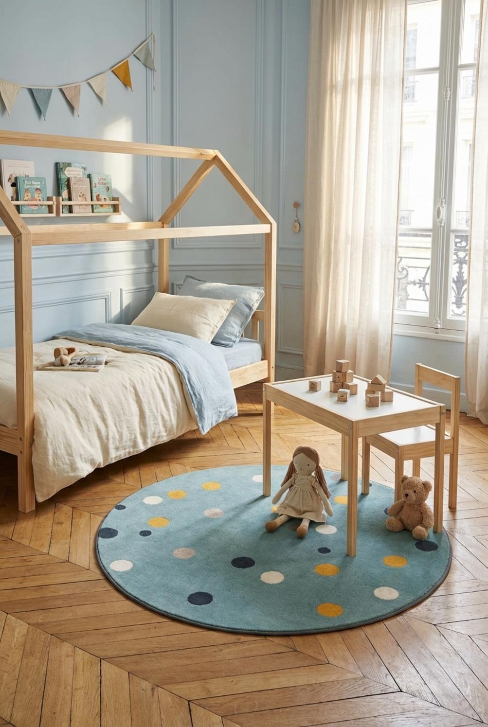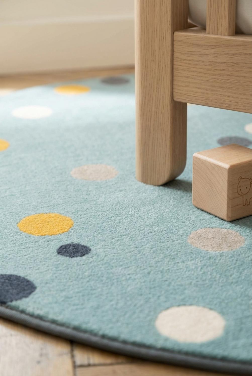 Quand vient l’heure du jeu, les motifs à pois deviennent points de repère pour les petites mains, support de comptines, cachettes de voitures et chemins imaginaires. Les textures invitent à s’asseoir, rouler et se blottir ; le confort est là pour prolonger la lecture du soir ou la sieste lumière, transformant le sol en un véritable cocon familial où l’imaginaire prend racine.