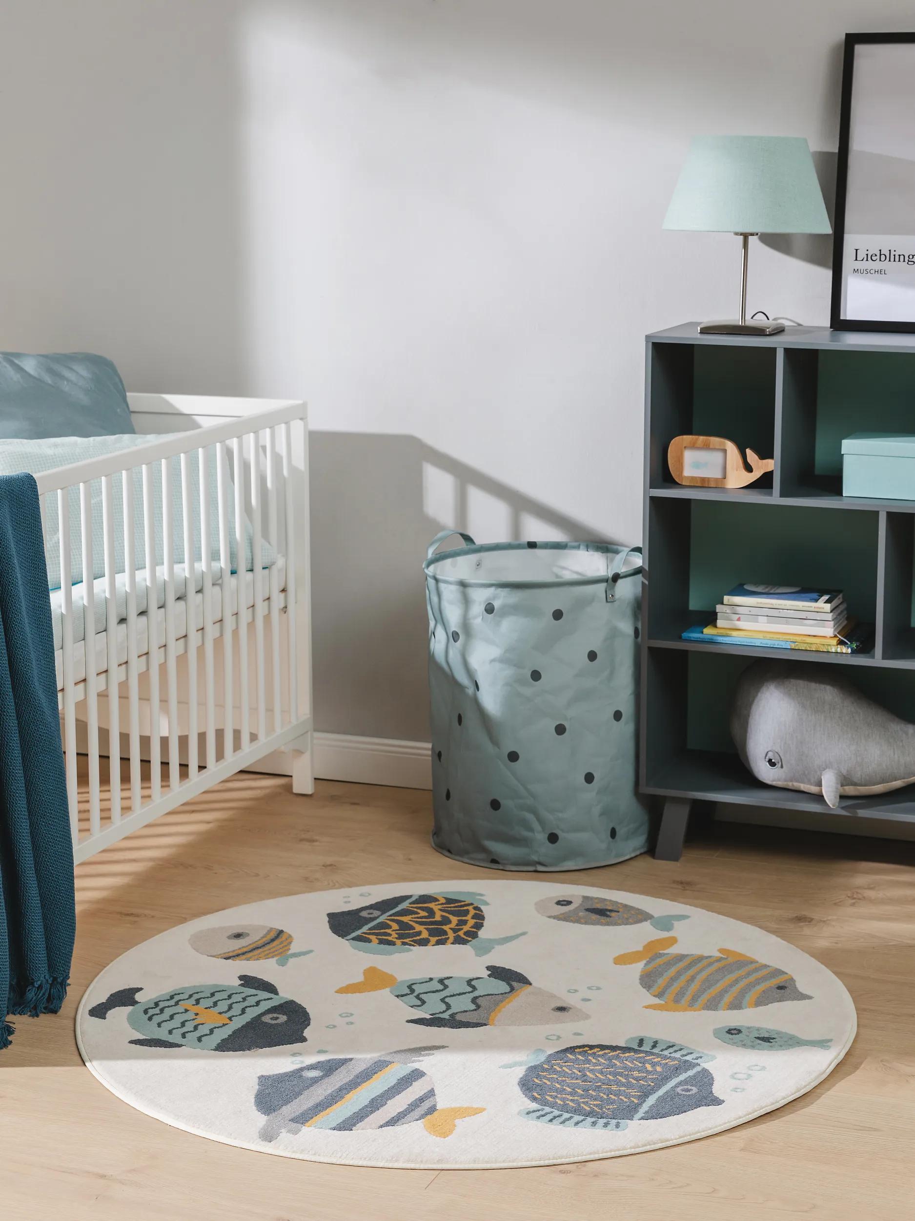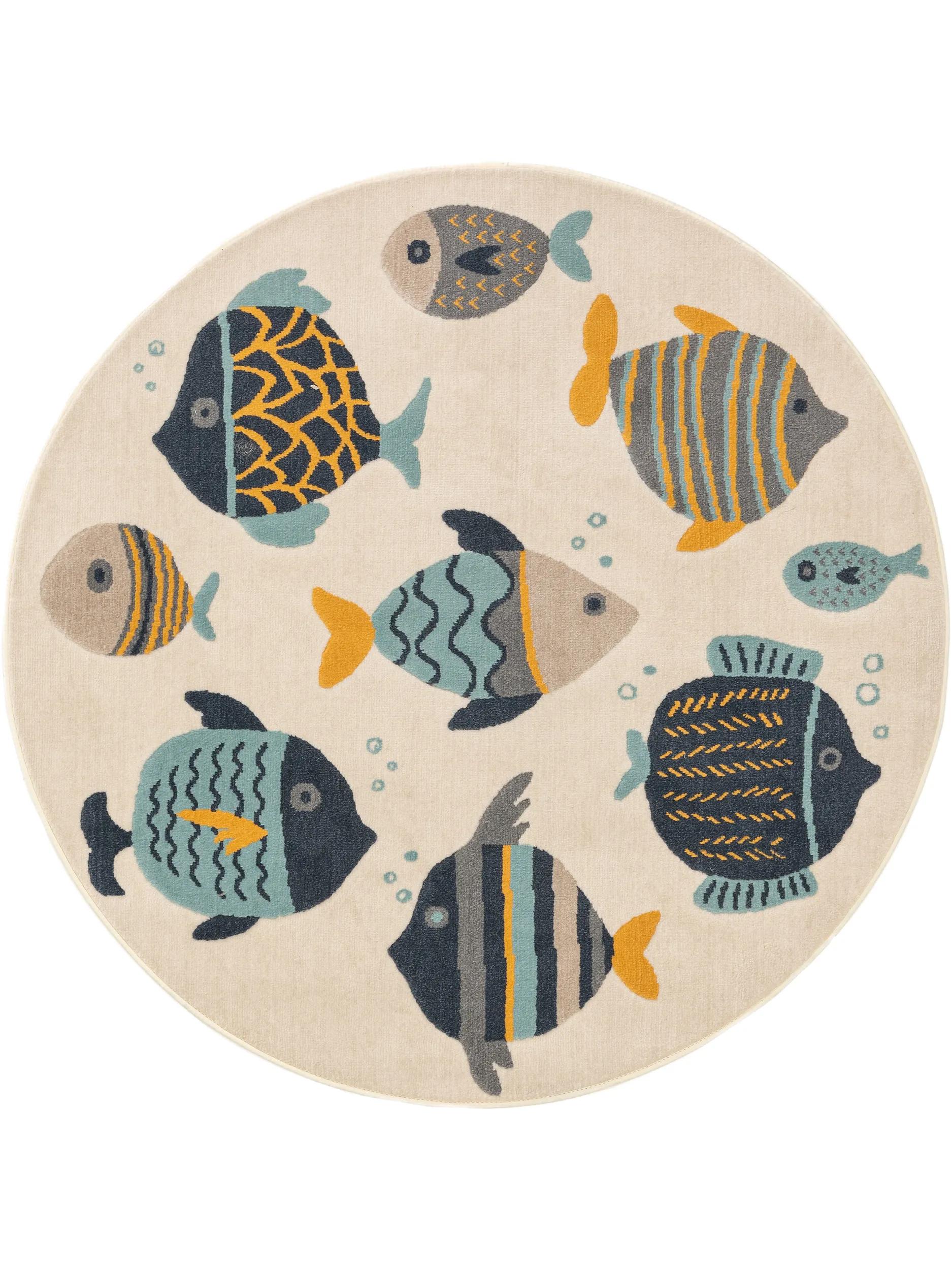 Tapis moderne motif animal poissons rond enfant beige bleu et orange 120 cm de diamètre