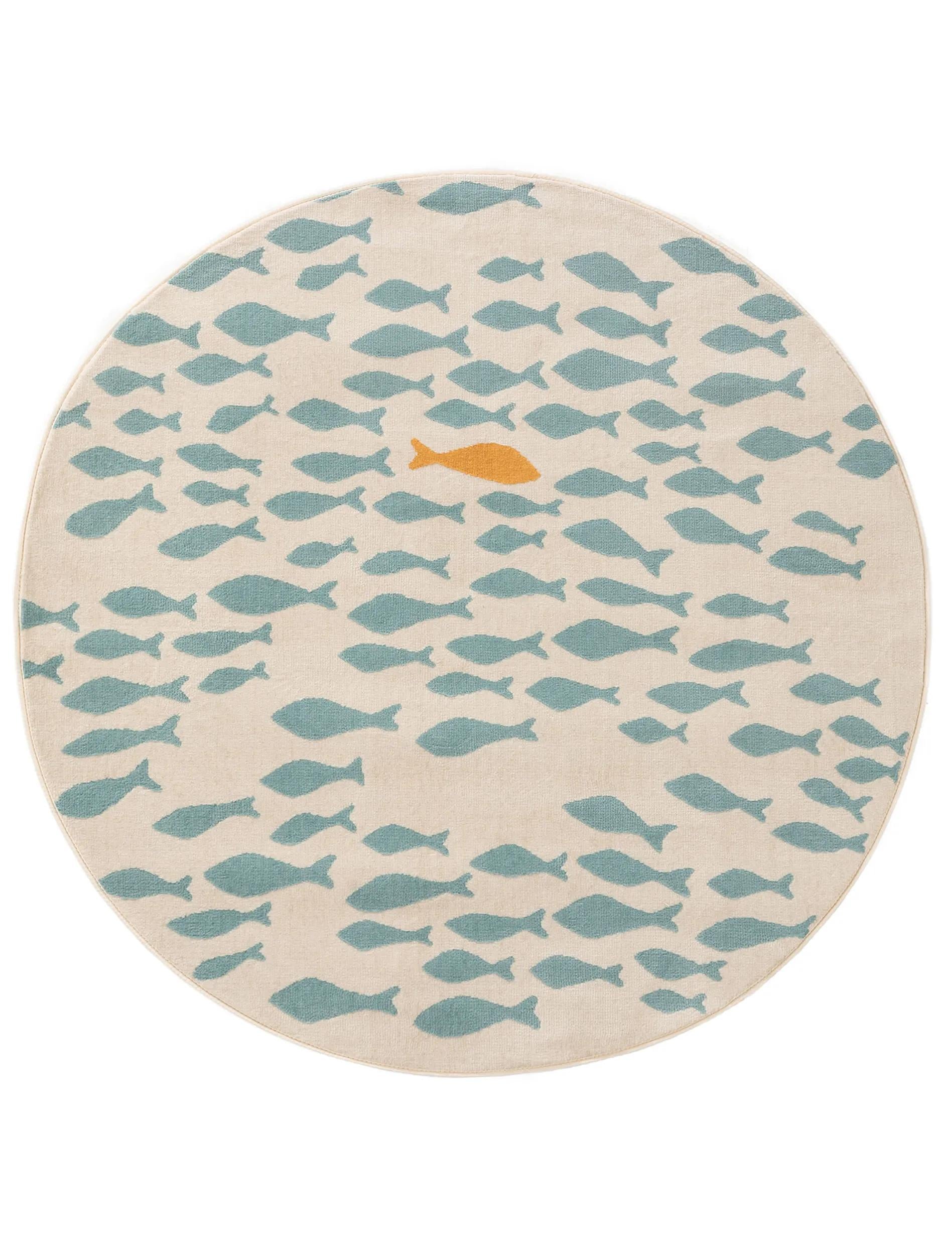Tapis moderne motif animal poissons rond enfant beige et bleu 120 cm de diamètre