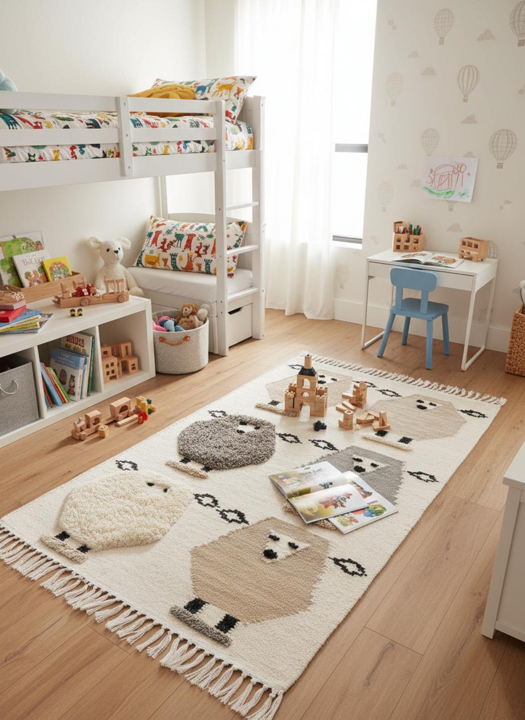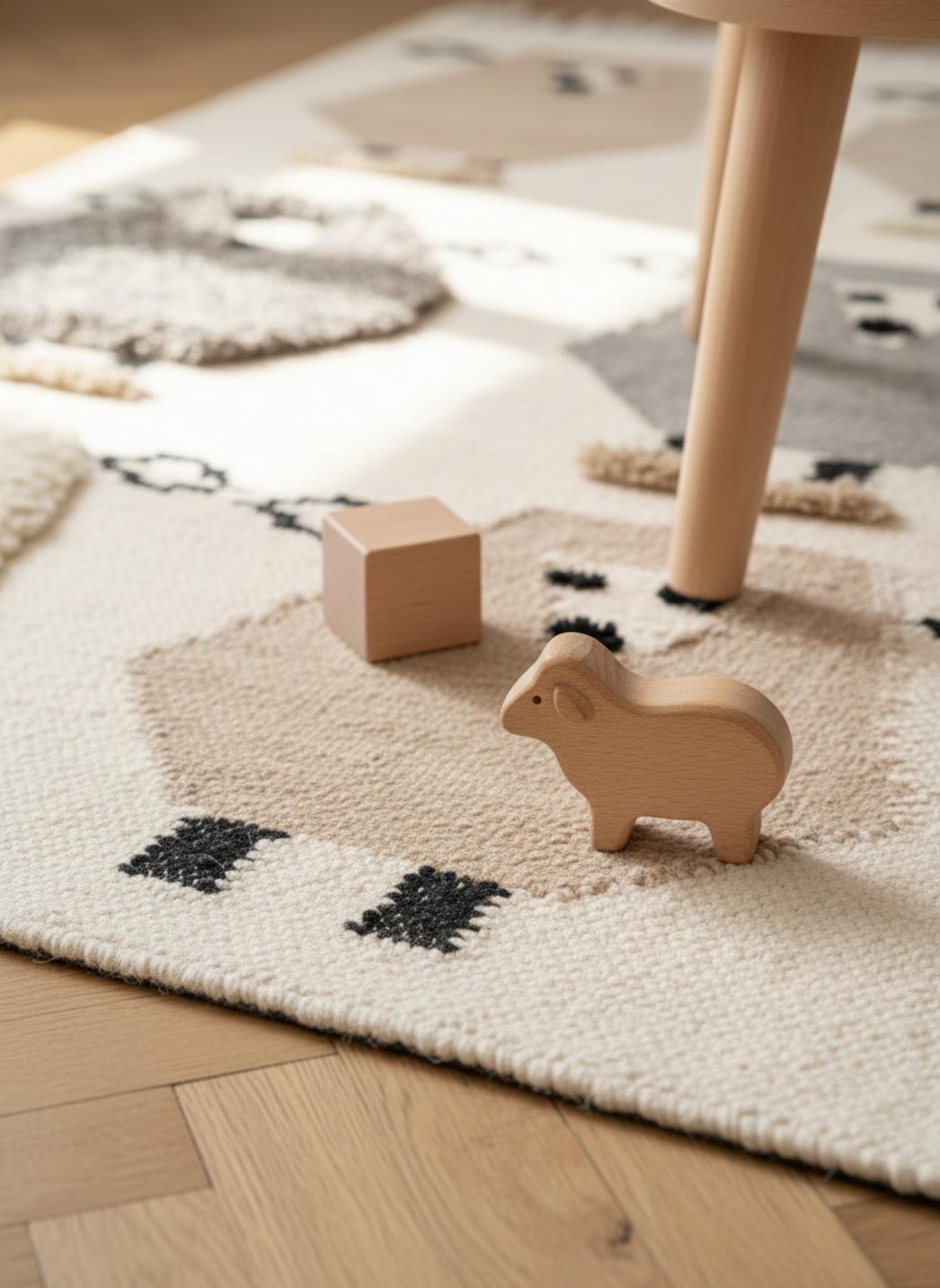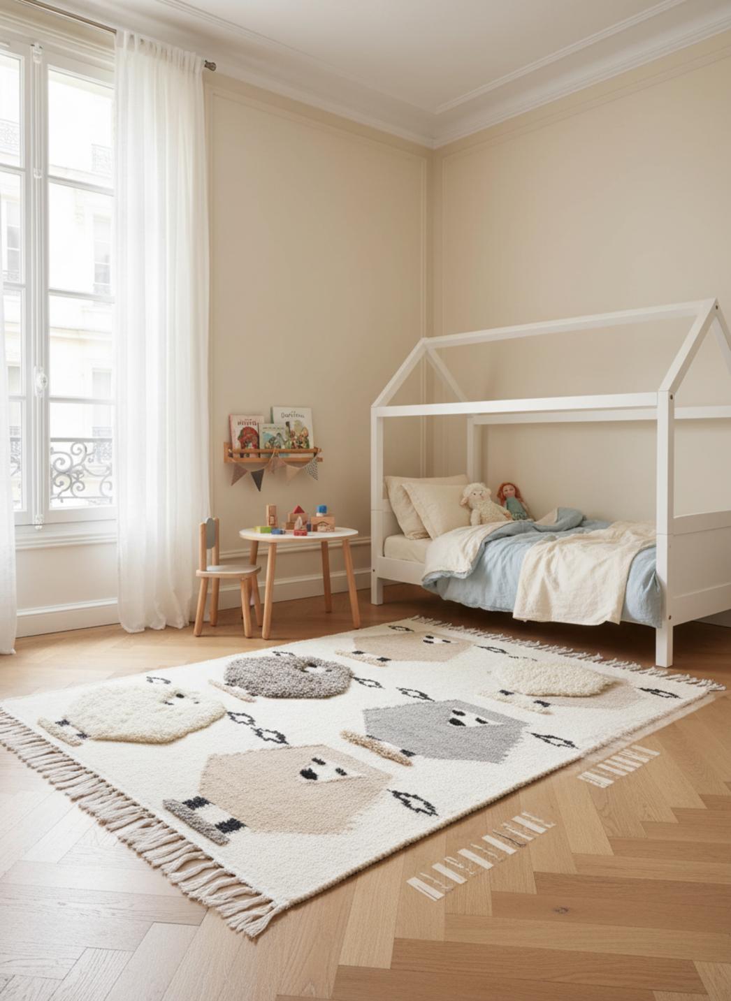 Dans la chambre, les tons doux apportent une sensation d’apaisement : la teinte crème diffuse la lumière de la fenêtre et se marie aux matières naturelles du mobilier, aux paniers en osier et aux plaids en maille. Les routines du soir deviennent plus tendres, entre lecture sur le tapis et câlins avant le coucher, tandis que le tissage résiste au passage du temps et aux jeux répétés, facilitant l’entretien pour des parents qui ont besoin de praticité au quotidien.