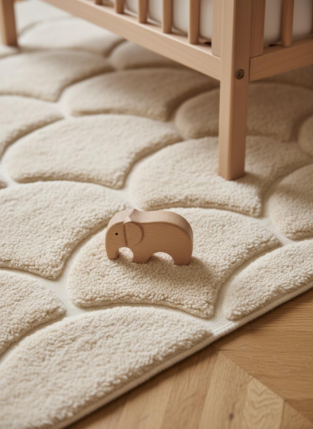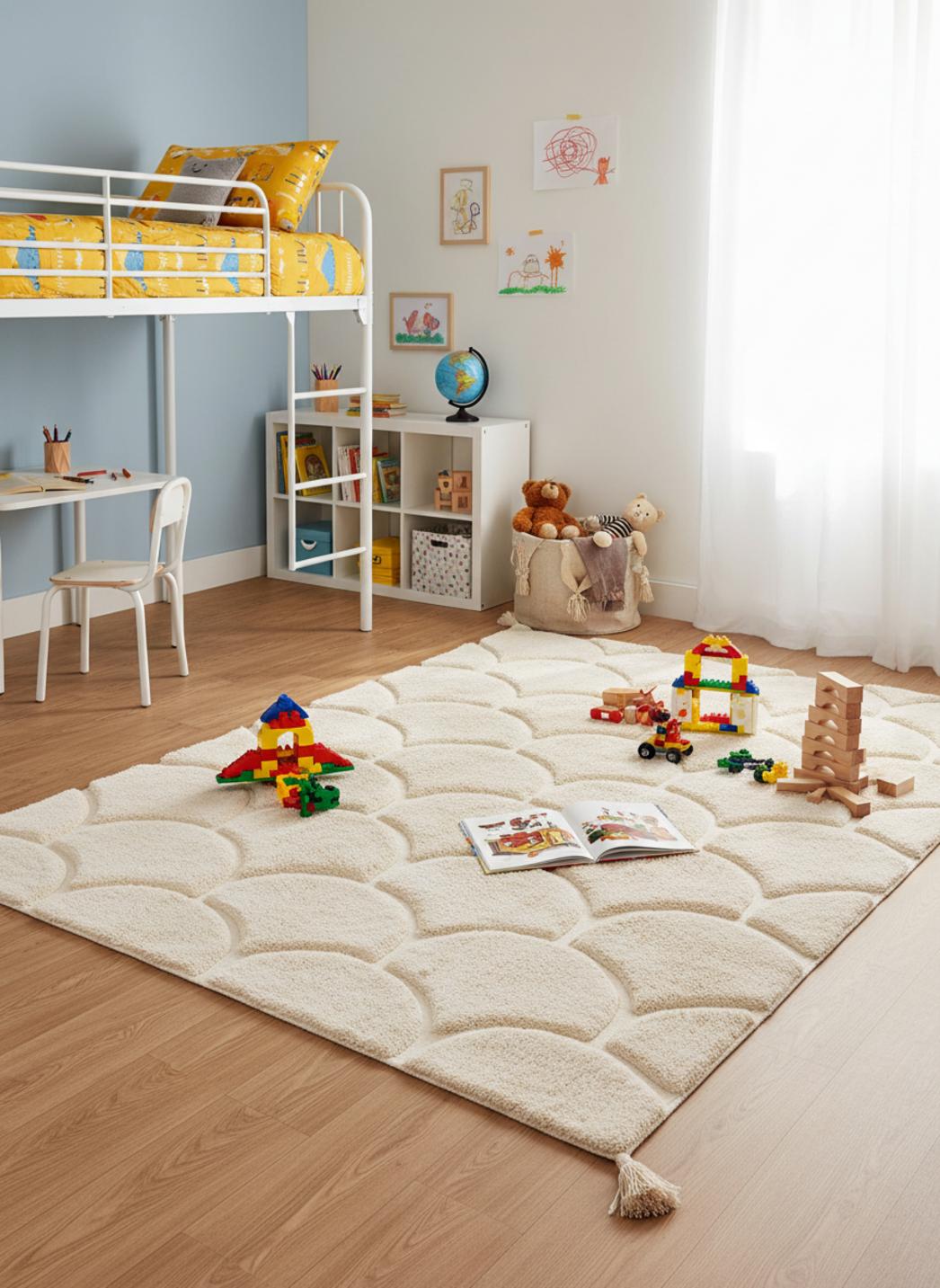 Chaque scène se dessine avec simplicité : un puzzle posé au centre, une couverture étalée pour un goûter ou une lecture à deux, les rires qui résonnent sans que rien ne glisse. Le dessin en forme d’arche devient terrain de jeu et repère visuel, aidant l’enfant à organiser ses espaces de jeu et à développer son imaginaire dans un intérieur apaisé et moderne.