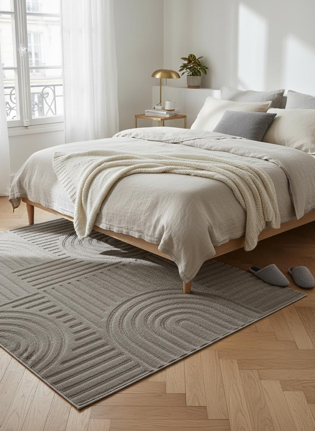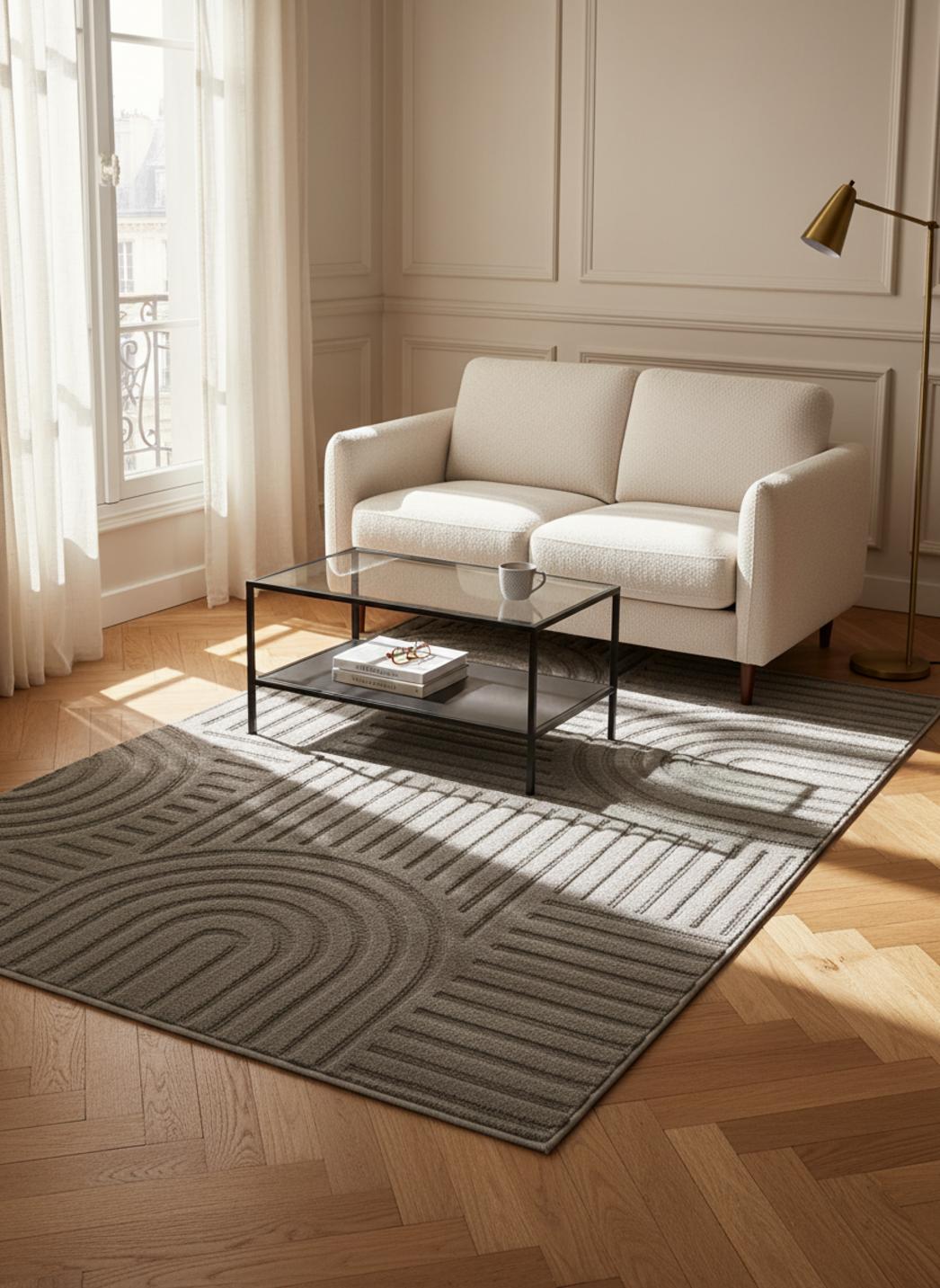 La présence d’un motif en demi-lunes transforme le sol en partition visuelle où chaque arches dialogue avec l’espace, créant un rythme paisible et affirmé. Le dessin joue sur des volumes contrastés, des pleins et des vides qui structurent la pièce sans l’alourdir, et une nuance centrale de gris offre une base chaleureuse et contemporaine.