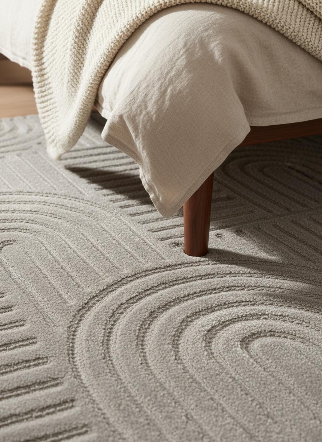 Sous les pas, la matière révèle une présence tactile qui complète l’esthétique. Le velouté dense invite à ralentir, à poser le pied et à sentir la douceur du tissage. La construction offre un relief subtil qui capte la lumière, crée de l’ombre et enrichit la profondeur visuelle du motif sans nuire à la simplicité du dessin.