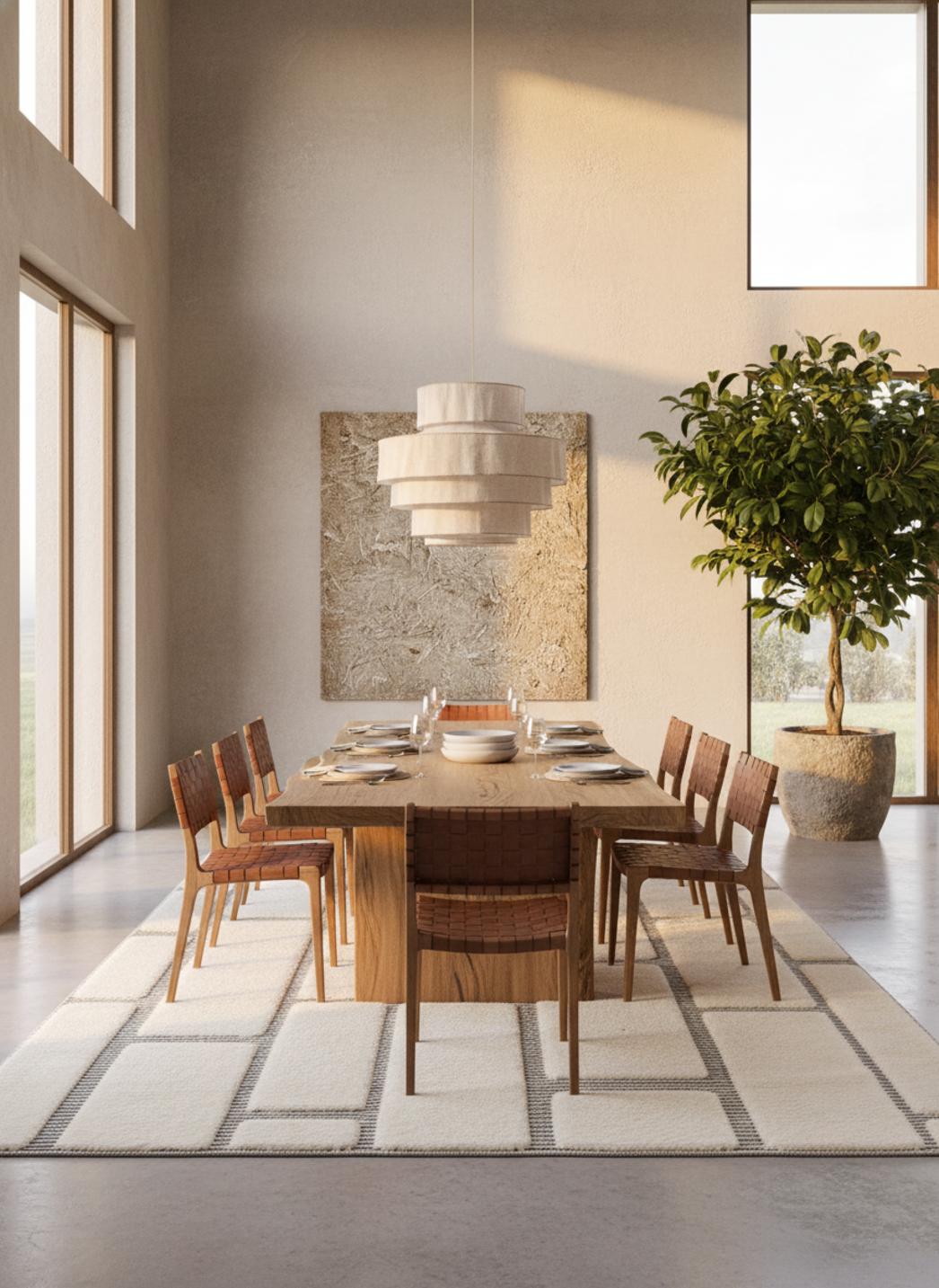 La présence de ce tapis modernise l'ambiance en apportant une note graphique et chaleureuse, tout en respectant la simplicité du lieu ; il amplifie la sensation d'équilibre et valorise le mobilier actuel par son calme visuel. Pour découvrir d’autres créations contemporaines et design, explorez également notre collection complète de tapis modernes.