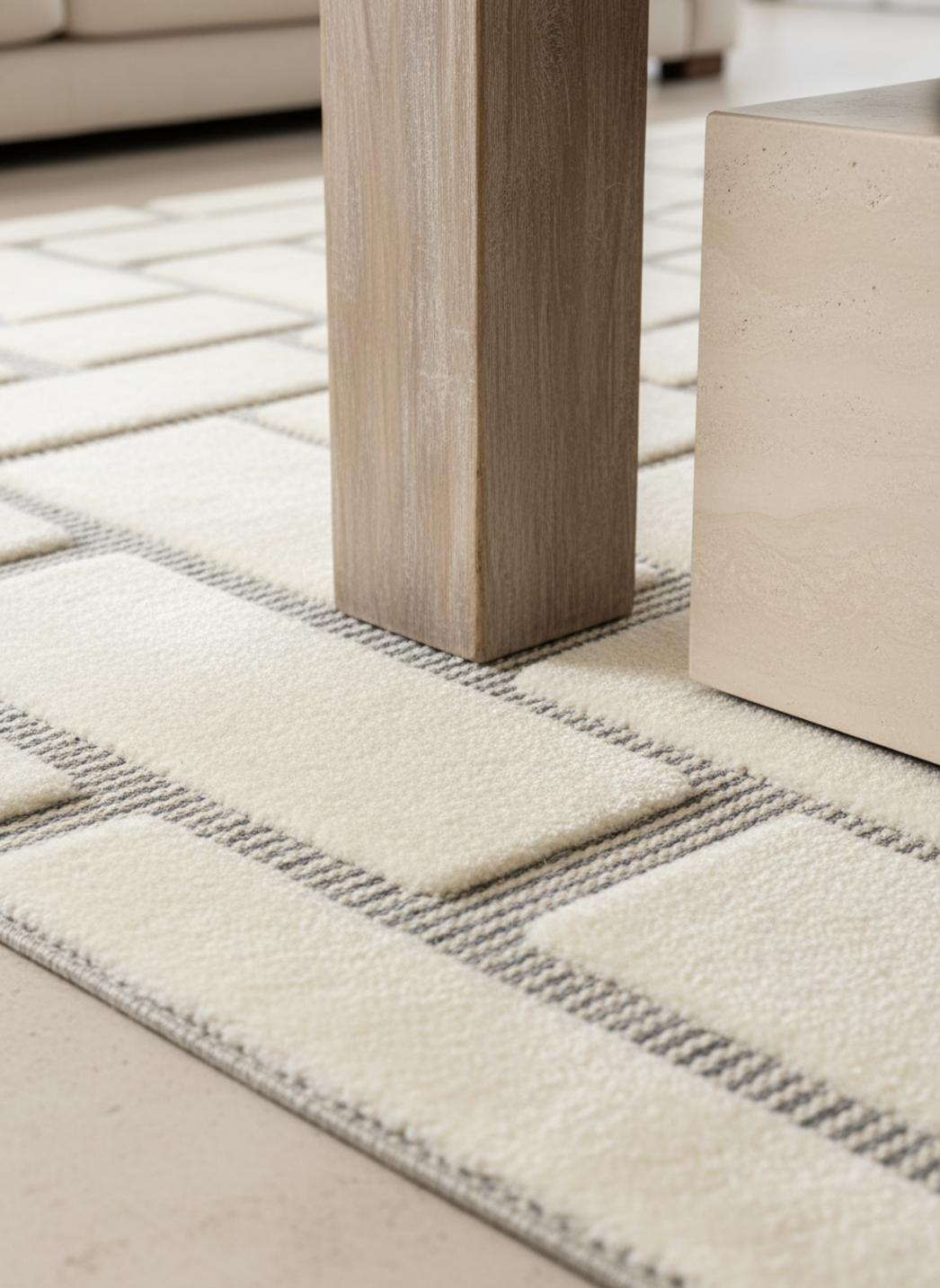Inspirée par l'architecture urbaine, la pièce laisse transparaître un graphisme soigné où le motif joue la délicatesse plutôt que la surcharge. Le relief évoque la répétition d'une structure connue, réinterprétée avec sobriété pour souligner l'esprit moderne du dessin. Les volumes restent calmes, les plans se superposent avec justesse et le tapis devient une surface qui respire, apportant une présence visuelle sans surcharger l'espace.