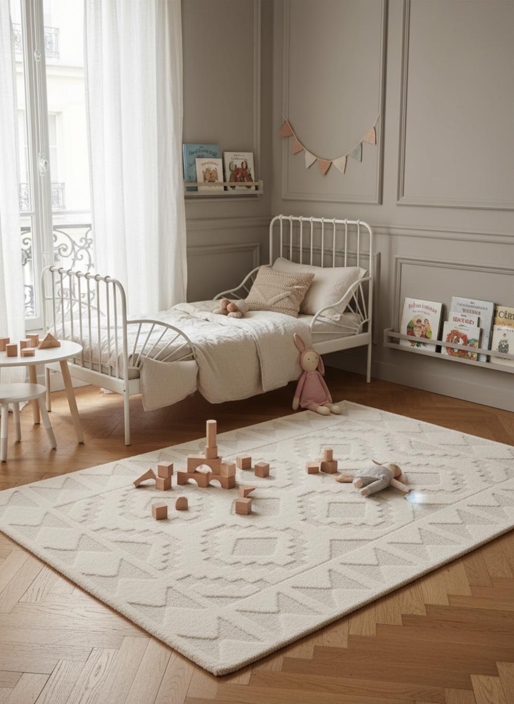 Imaginez un sol qui invite aux histoires du soir et aux éclats de rire, une nuance tendre entre crème et beige qui pose une ambiance apaisante dans la chambre de votre petit. Ce motif délicatement inspiré d’un univers ethnique apporte caractère sans agresser, se mariant aux meubles en bois clair et aux guirlandes lumineuses pour créer un véritable cocon où chaque coin devient une scène pour l’imaginaire.