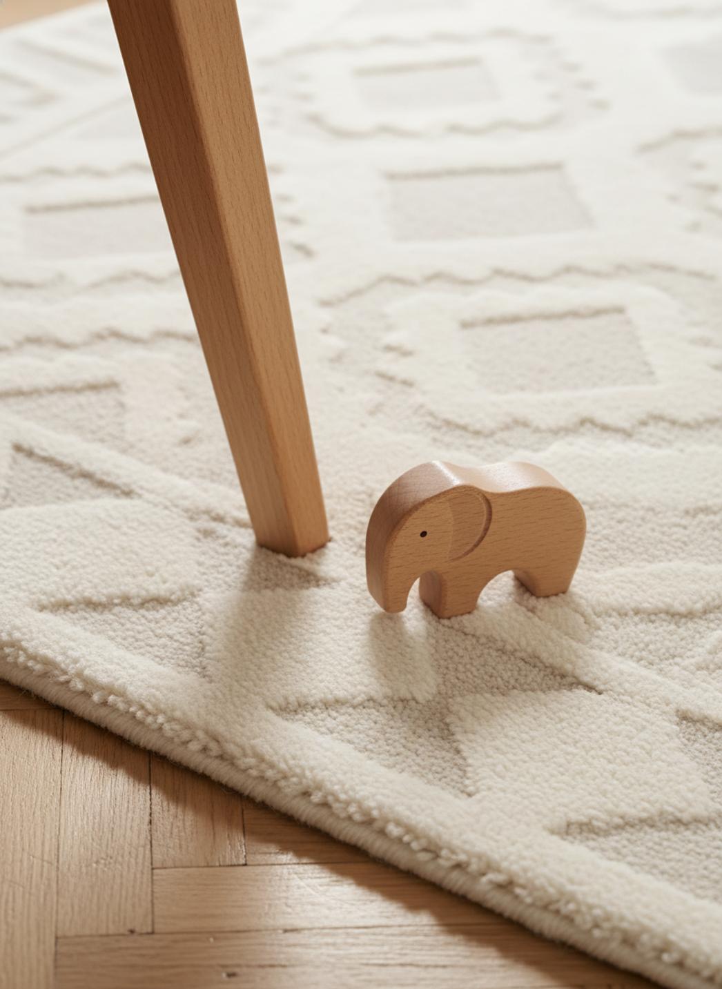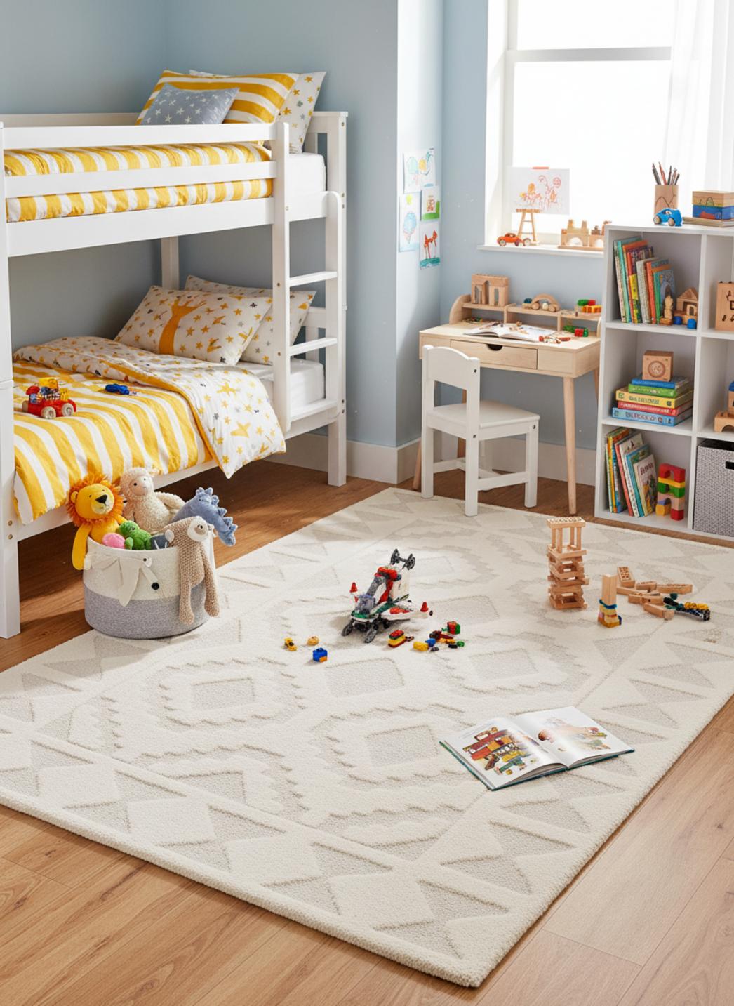Quand la lumière du matin caresse la pièce, le rendu moderne du motif danse avec les ombres, donnant à la chambre une énergie douce et inspirante. Vous verrez ce tapis devenir la scène des routines du soir — un coin lecture où l’on chuchote, un arrière-plan pour les petites aventures et le lieu doux des retrouvailles familiales après une journée bien remplie. Sa teinte neutre facilite l’association avec peluches, coussins et boîtes de rangement colorées.
