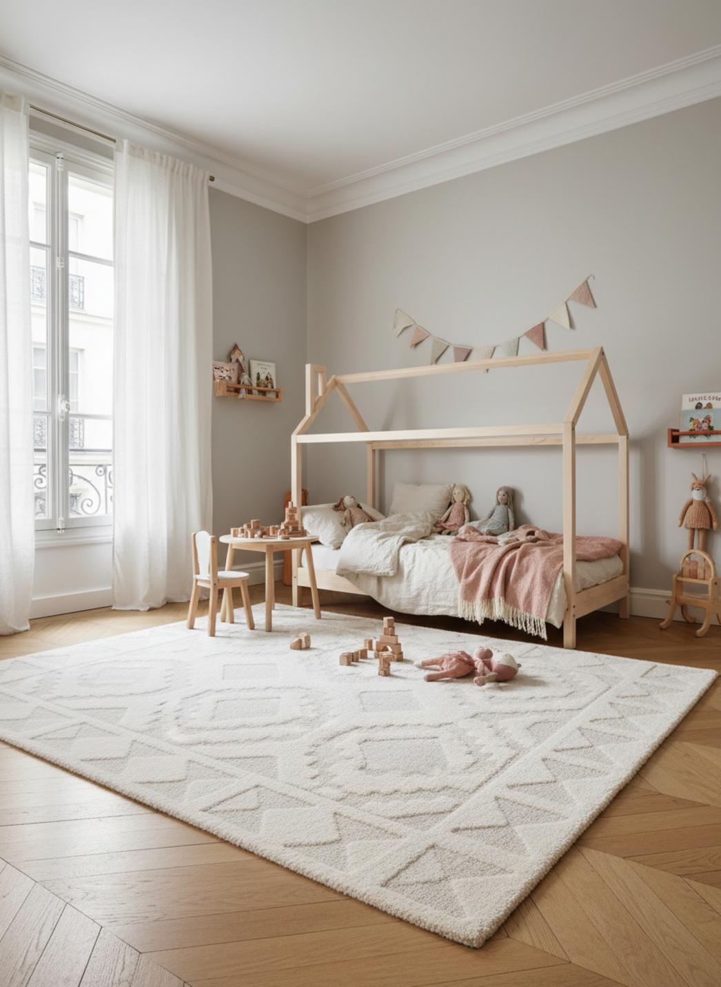 Imaginez la porte qui s’ouvre sur une chambre baignée de lumière douce, où les tons crème et beige créent immédiatement un cocon apaisant. Les parents y déposent un moment de calme après l’école, la lampe abat-jour déploie une lumière tamisée et le tapis, posé au centre, invite aux confidences et aux lectures avant le coucher, rendant l’espace à la fois contemporain et rassurant grâce à une allure volontairement moderne.