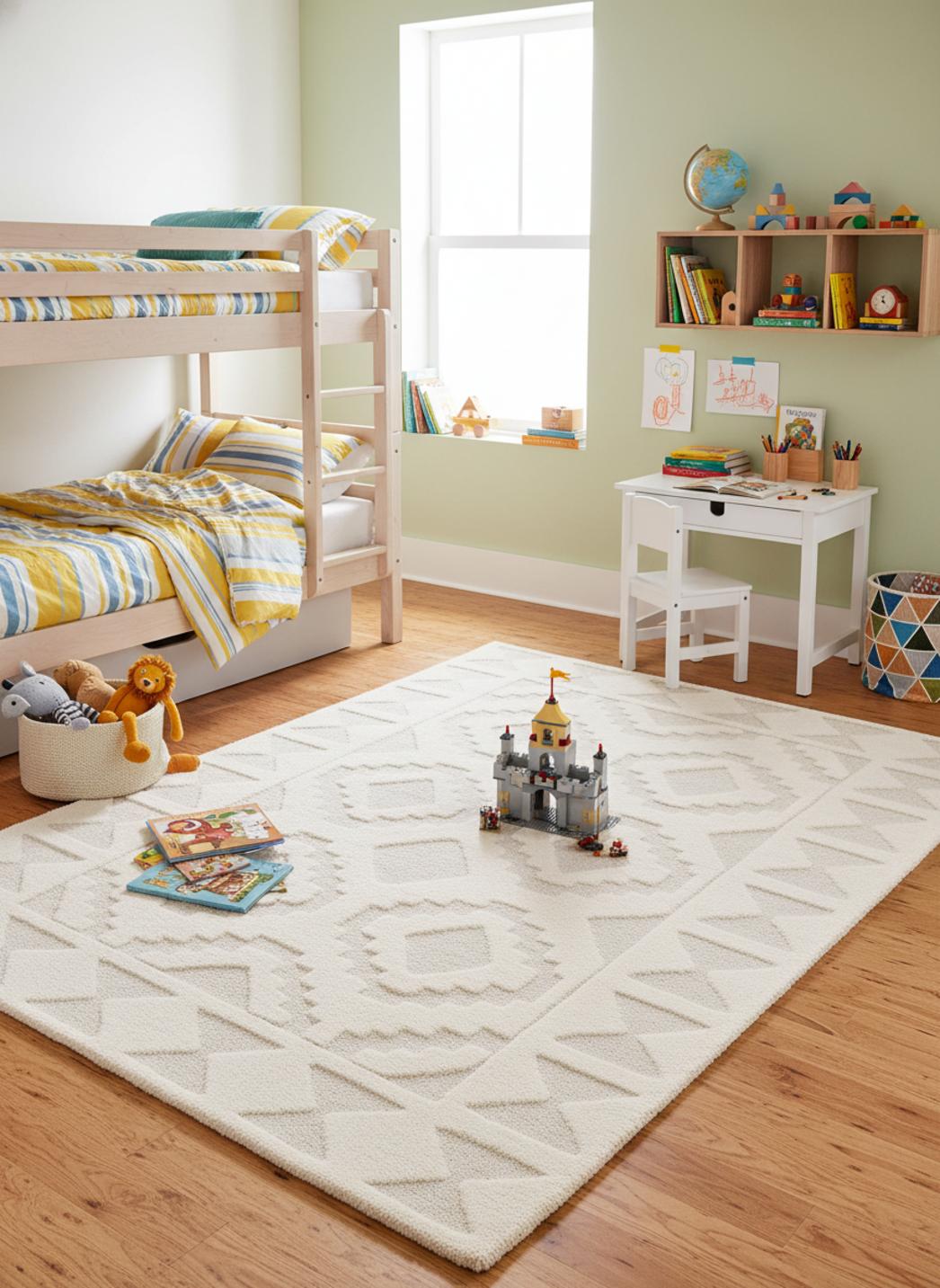 Osez les après-midis en famille, où l’on s’allonge pour feuilleter des albums, où les rires se mélangent aux coussins. Conçu pour l’univers enfant, ce tapis devient le théâtre des explorations imaginaires : routes dessinées, petits animaux cachés, cabanes improvisées. Le motif inspire des histoires lointaines sans imposer, laissant libre cours aux jeux et à la créativité tout en restant harmonieux dans la chambre.
