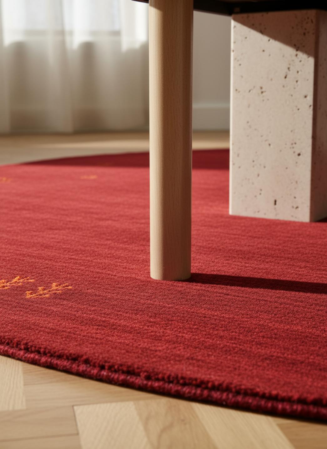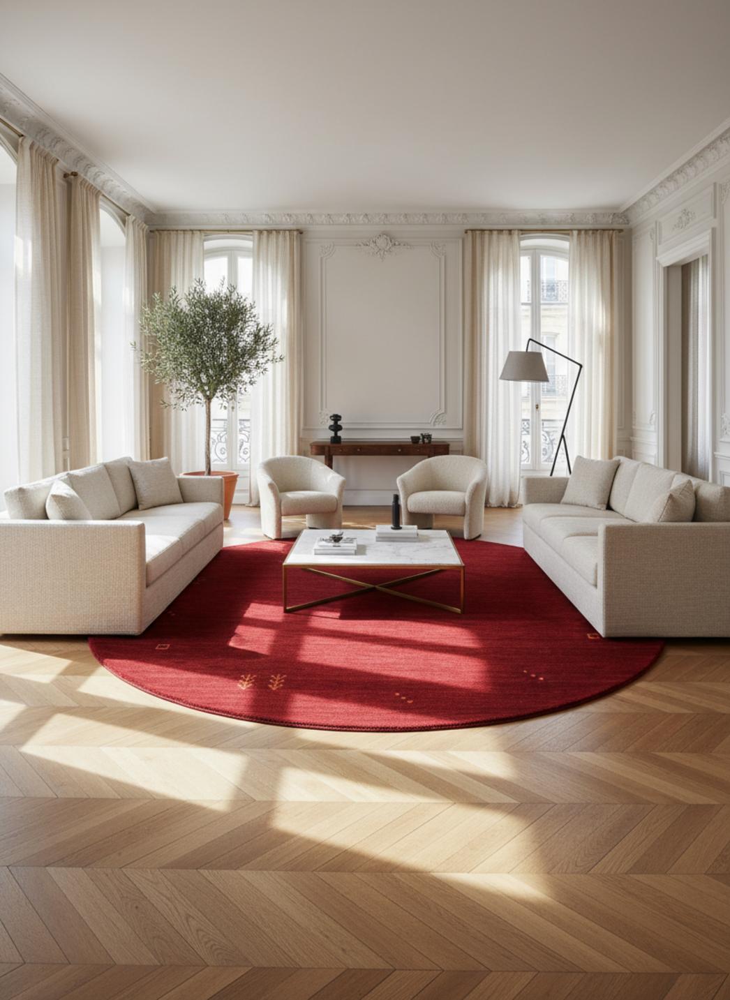 Il imagine des scénarios de mise en scène : posé sous une table basse minimaliste, il crée une scène conviviale ; face à un canapé aux lignes épurées il réchauffe le jeu des volumes ; dans une chambre il invite à la détente et à la douceur du matin. Le tapis organise l’intérieur sans imposer, valorise les matières environnantes et répond aux besoins d’un habitat contemporain qui privilégie l’équilibre visuel et la fonctionnalité discrète.