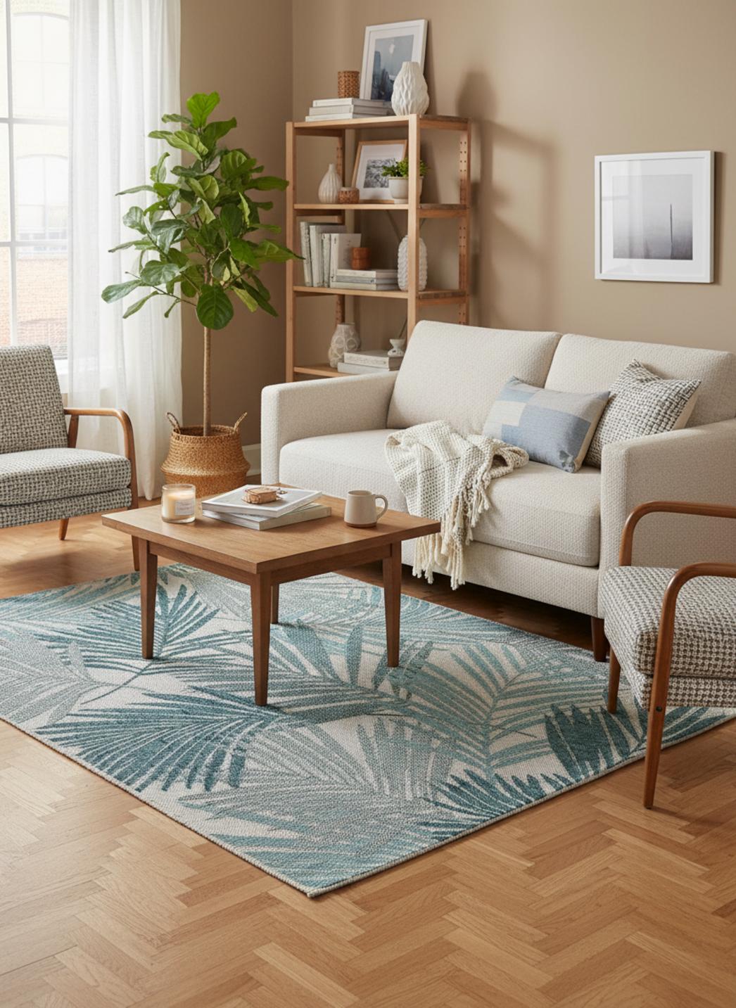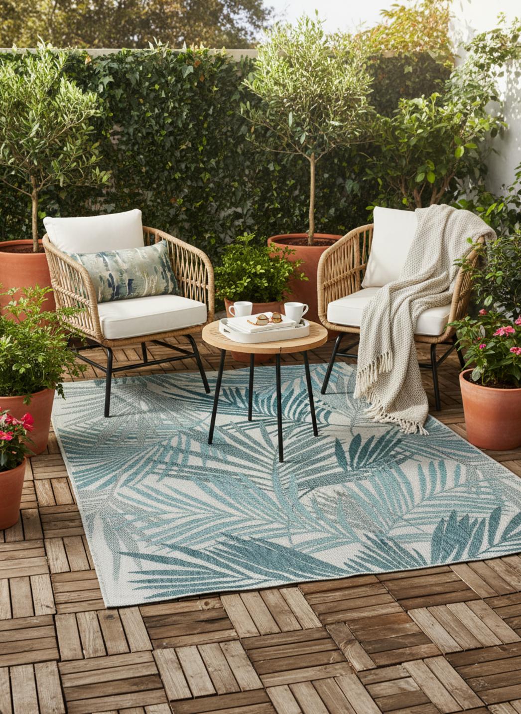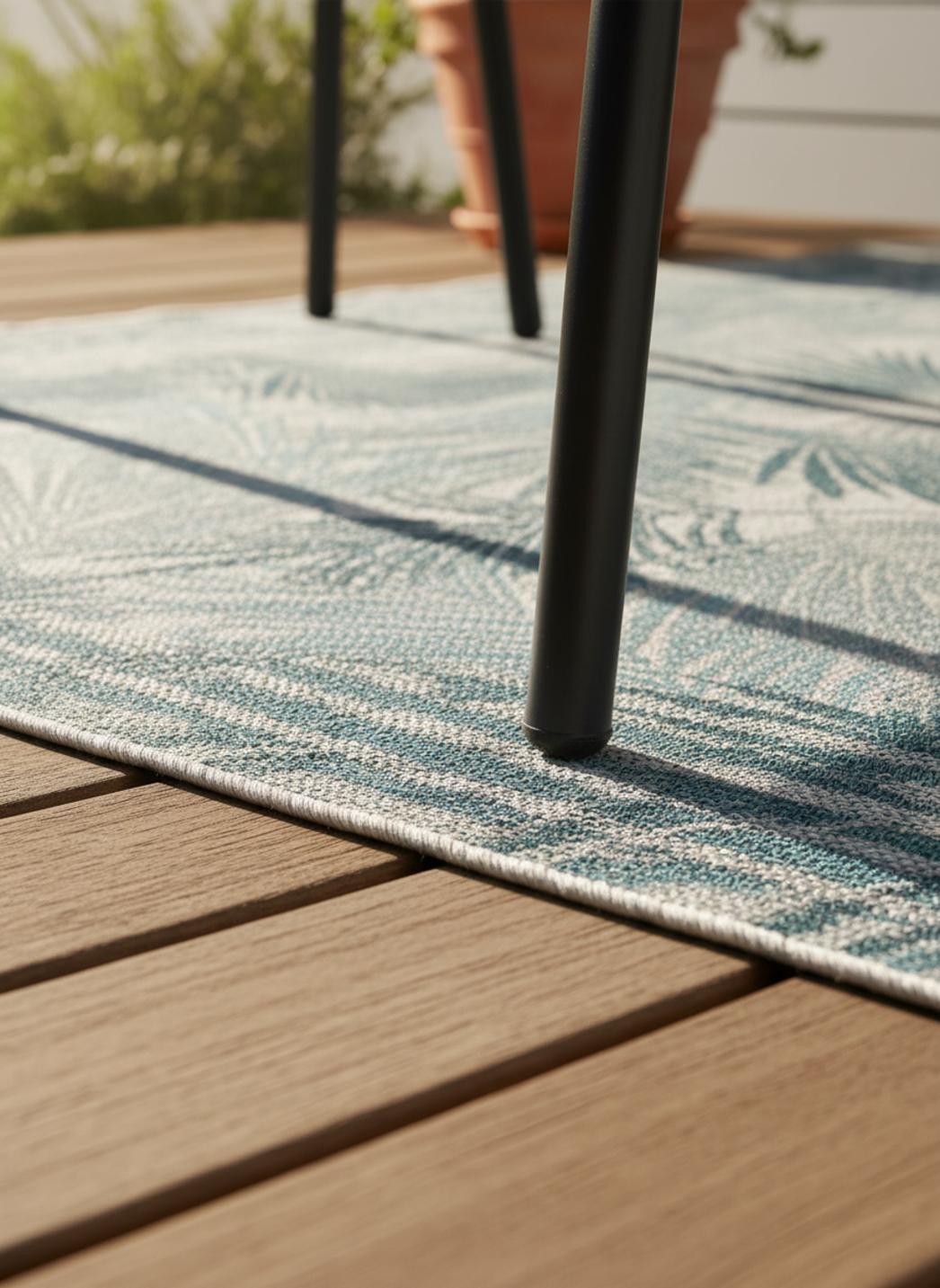 Élégant et frais, ce tapis au style moderne séduit par son motif feuille et l’harmonie apaisante de ses tons bleu et gris. Dans un format de 80x150 cm, il s’intègre parfaitement sur une terrasse, un balcon ou un petit patio, apportant une touche de nature stylisée et contemporaine à la décoration extérieure. Ses motifs délicatement dessinés rappellent le mouvement des feuillages dans la brise, créant une atmosphère sereine et équilibrée. Le bleu, symbole de calme et de fraîcheur, s’associe subtilement au gris, plus neutre et moderne, pour composer un ensemble lumineux et reposant. Ce tapis s’accorde à merveille avec des matériaux naturels comme le bois, la pierre ou le rotin, et s’intègre aussi bien dans une ambiance épurée que bohème chic. Placé sous une petite table ou dans un coin détente, il structure l’espace tout en diffusant une douceur visuelle. Véritable invitation à la détente, il transforme les extérieurs en lieux paisibles, harmonieux et élégants.