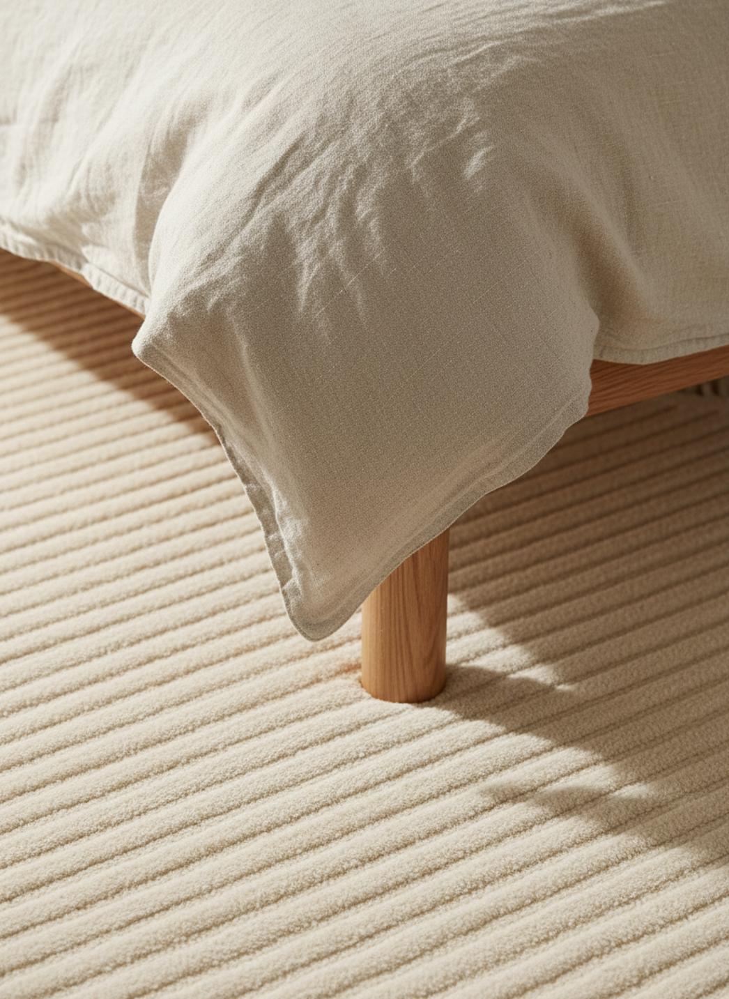 Douce sous les pieds, la surface révèle un relief feutré qui capte la lumière différemment selon l’inclinaison et le pas. Les zones claires amplifient la sensation de volume, tandis que les modules plus soutenus structurent l’ensemble. Le résultat est une harmonie tactile où la matière traduit une présence discrète et réconfortante, idéale pour prolonger les après-midis feutrés et les conversations tranquilles.