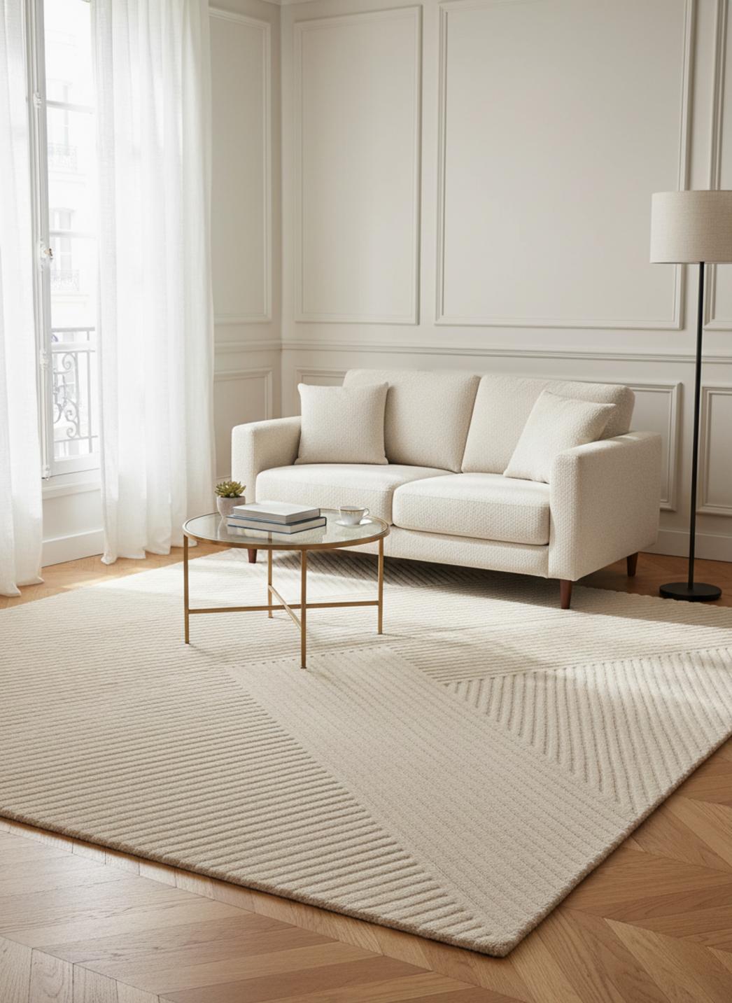 Pensé pour définir un coin lecture ou recentrer un salon, le format met en place un axe visuel très structuré. Les proportions de 120x170 cm permettent d’encadrer un canapé, d’accentuer une table basse ou de souligner une commode, tout en préservant le confort de circulation. L’objet joue le rôle d’ancre et d’assise graphique, déclenchant une profondeur douce qui s’apprécie au fil des pas.