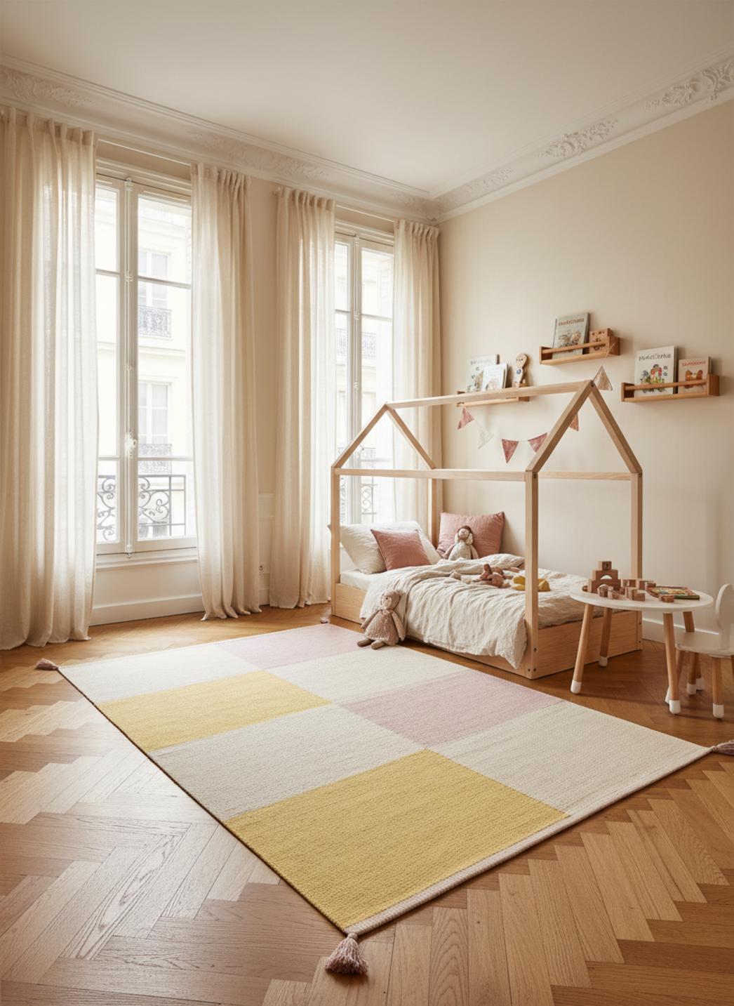 Demain matin, au réveil, ce tapis au motif géométrique devient terrain d'exploration pour les jeux au sol et coin lecture pour les histoires à deux voix ; il crée un point d'ancrage visuel dans la chambre, mettant en valeur le mobilier clair et les panneaux lumineux tout en stimulant l'imagination sans surcharger l'espace.