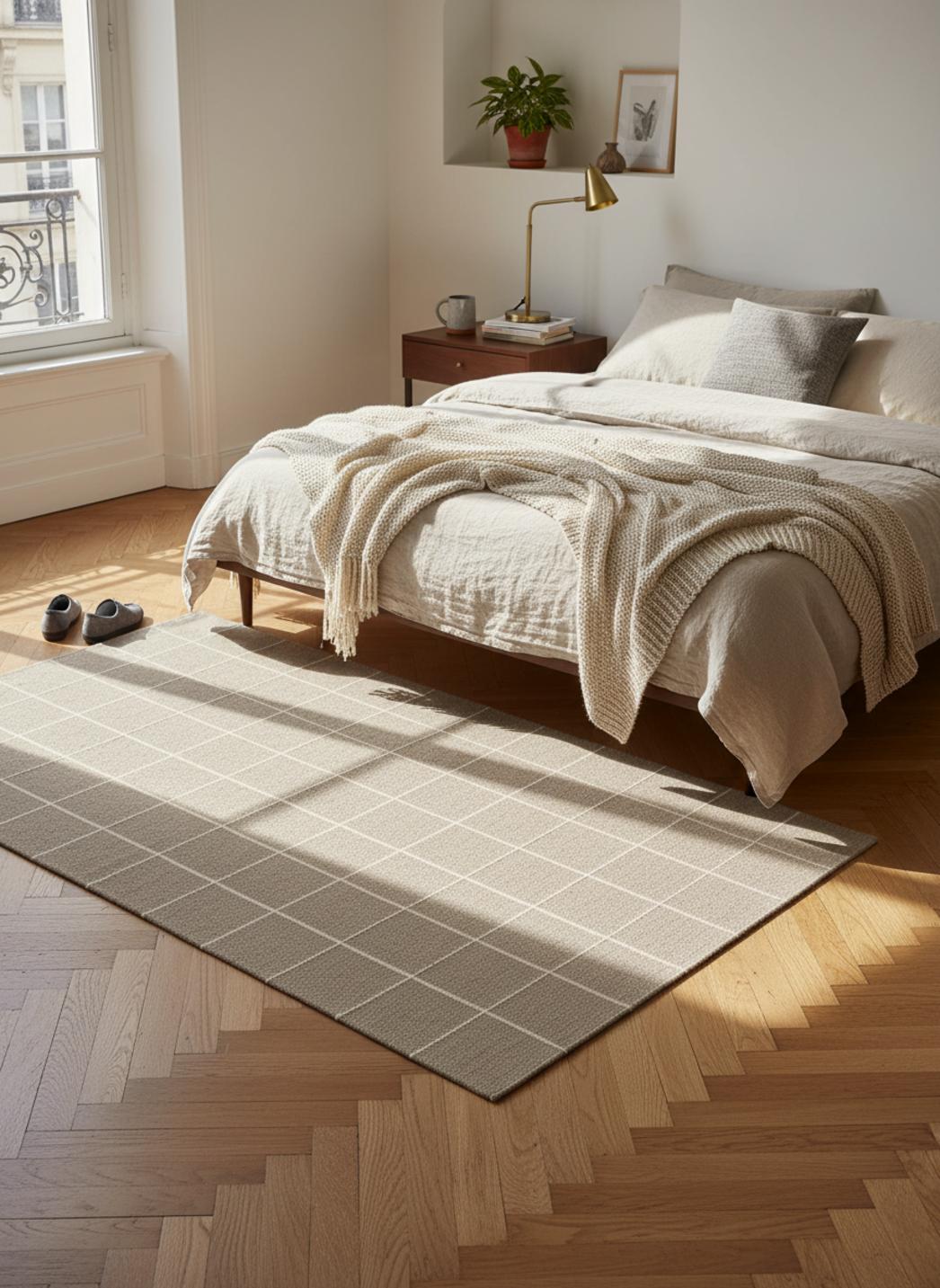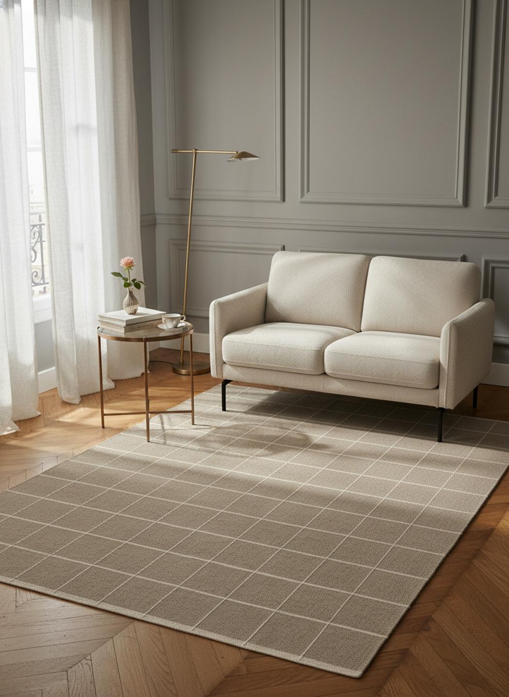 Son dessin mise sur l’équilibre entre plein et vide : blocs cadrés et interstices laissent circuler la lumière et ouvrent des perspectives. La palette de taupe tempère le contraste et offre une chaleur neutre, idéale pour ancrer un canapé bas ou pour dessiner un coin lecture. Le jeu d’ombres entre les carreaux crée une profondeur qui semble évoluer selon l’angle et l’intensité du jour.