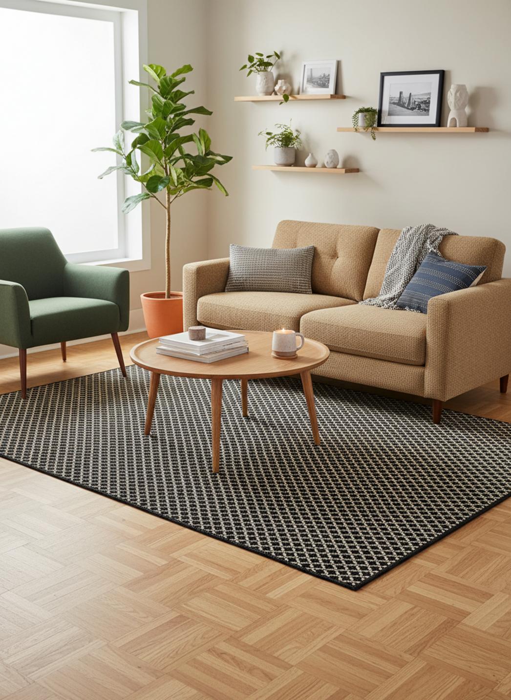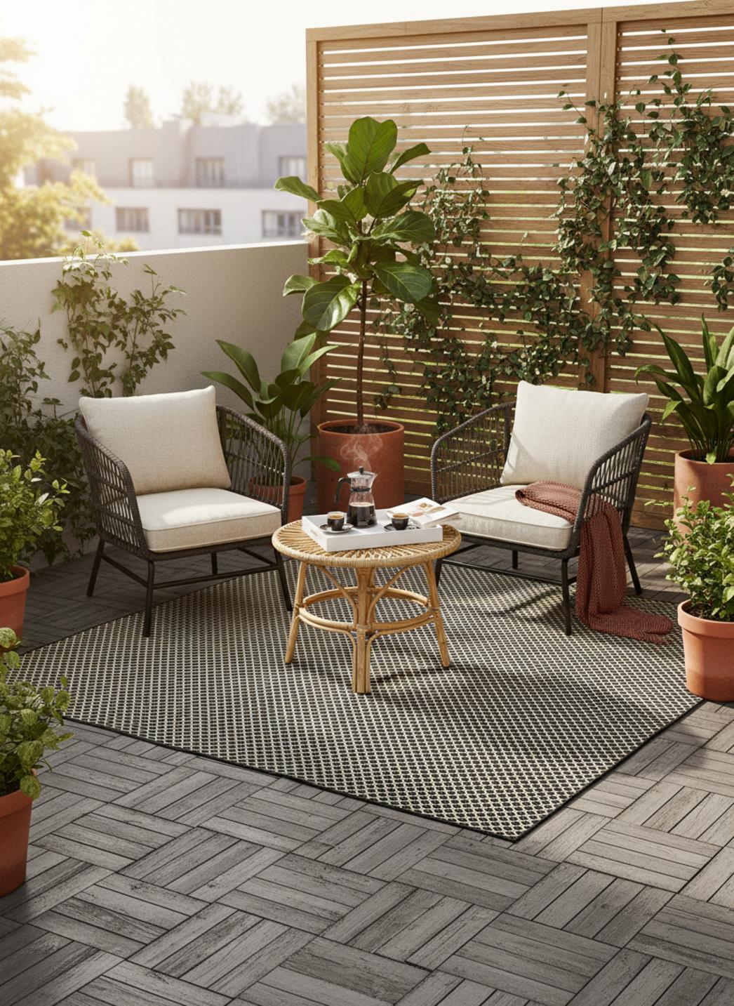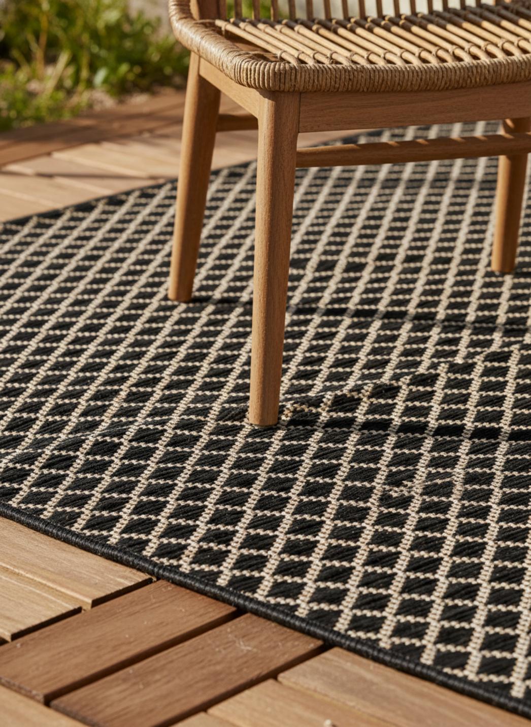 Dans un jeu subtil de contrastes, ce tapis moderne à motif losange noir attire le regard par son graphisme affirmé et sa sobriété élégante. Son format de 80x150 cm en fait un choix idéal pour structurer un balcon, un couloir extérieur ou une entrée de terrasse. Le noir, profond et intemporel, dessine des lignes nettes sur un fond clair, créant une dynamique visuelle à la fois contemporaine et raffinée. Chaque losange semble tracer un rythme géométrique, rappelant l’équilibre des motifs nordiques revisités dans un esprit urbain. Ce tapis d’extérieur définit avec justesse les espaces de passage tout en apportant une touche de caractère à la décoration. Sa petite dimension le rend pratique et élégant, parfait pour ajouter de la texture et du contraste sans alourdir la scène. Il incarne cette modernité sobre où la forme devient lumière, et où le noir, loin d’assombrir, révèle la force tranquille du design.