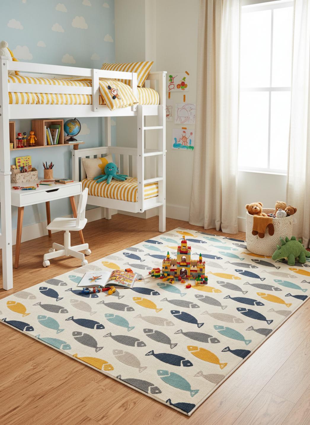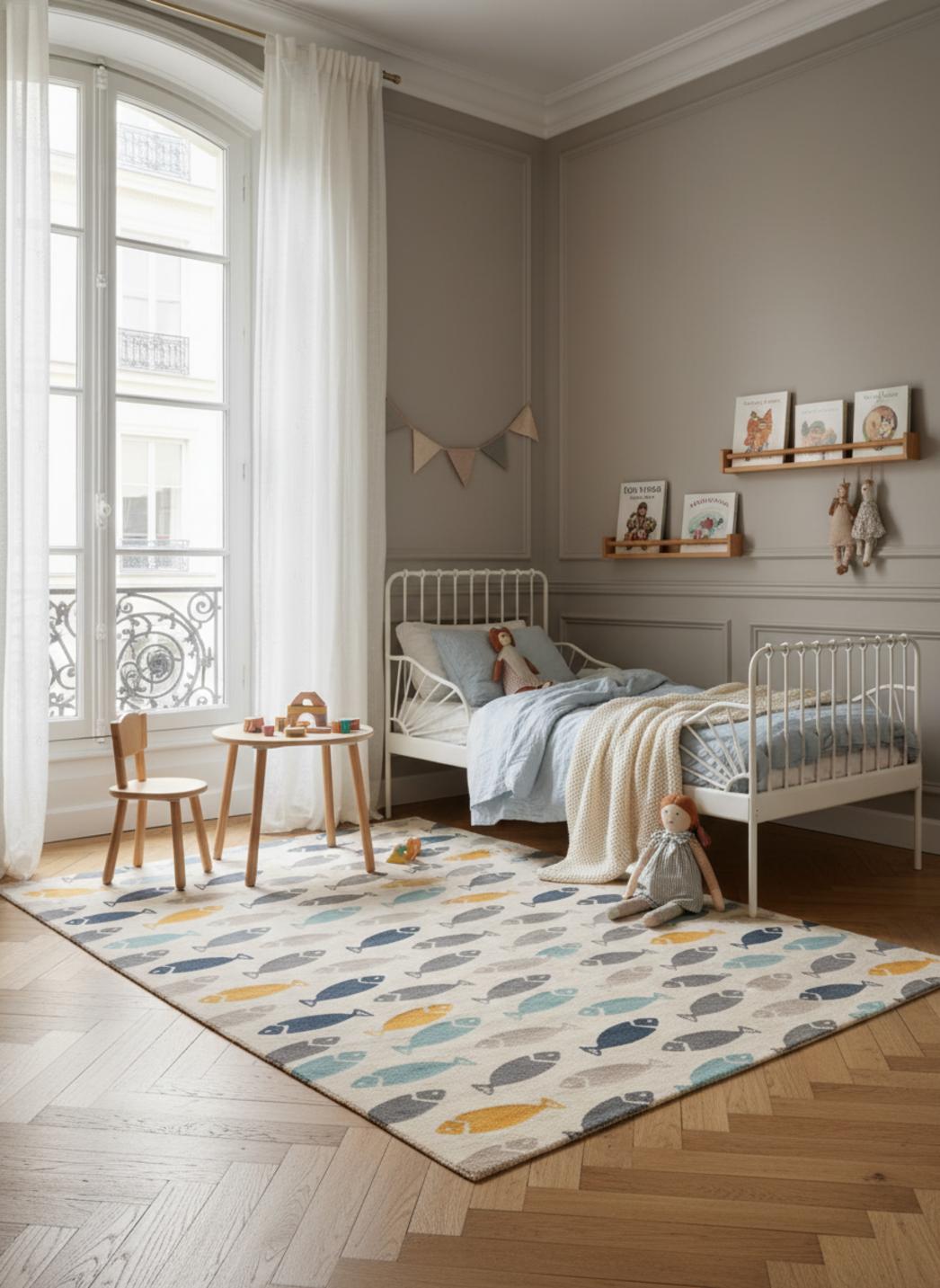 Imaginez une pièce baignée d'une lumière douce où votre tout-petit pose ses premières découvertes sur un sol qui rassure et invite au jeu : un tapis au style délicatement moderne qui transforme instantanément la chambre en un cocon chaleureux. Les teintes sableuses et notes vives s'accordent pour créer une atmosphère apaisante, où la décoration devient le refuge des lectures du soir et des siestes improvisées.