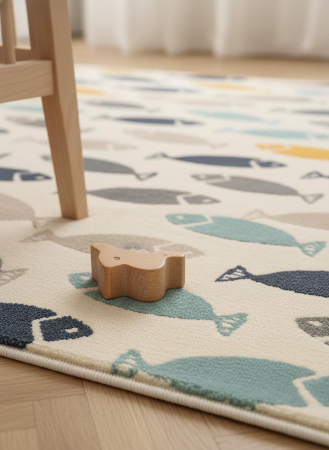 Lorsque les jouets s'étalent autour d'une lecture à deux voix, le motif inspiré de l'océan raconte des aventures : motifs marins qui éveillent l'imaginaire et encouragent l'exploration. Les parents retrouvent la scène des petits bateaux en tissu et des peluches, un espace pensé pour les premiers pas et les sessions de jeu au sol, où chaque mouvement est amorti avec douceur et stabilité.