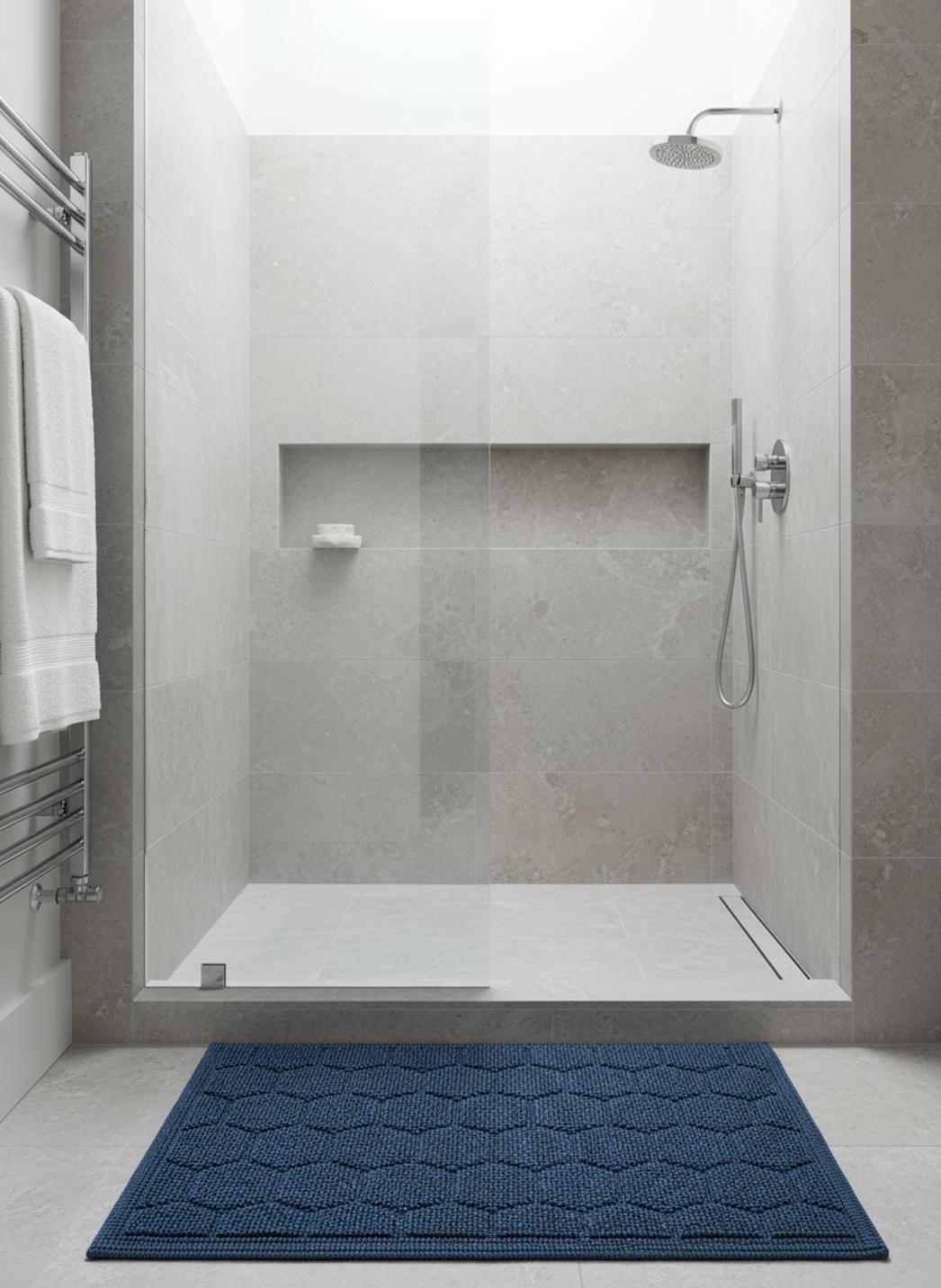 Dans un intérieur pensé pour la sérénité, ce tapis incarne une esthétique moderne où la sobriété rencontre la délicatesse sensorielle. La teinte profonde apporte une présence maîtrisée, capable d’apaiser une salle de bain sans la surcharger. Le jeu chromatique autour du bleu et du foncé crée un effet de profondeur lumineux qui dialogue avec des finis clairs et des matières naturelles, pour un rendu à la fois calme et raffiné.