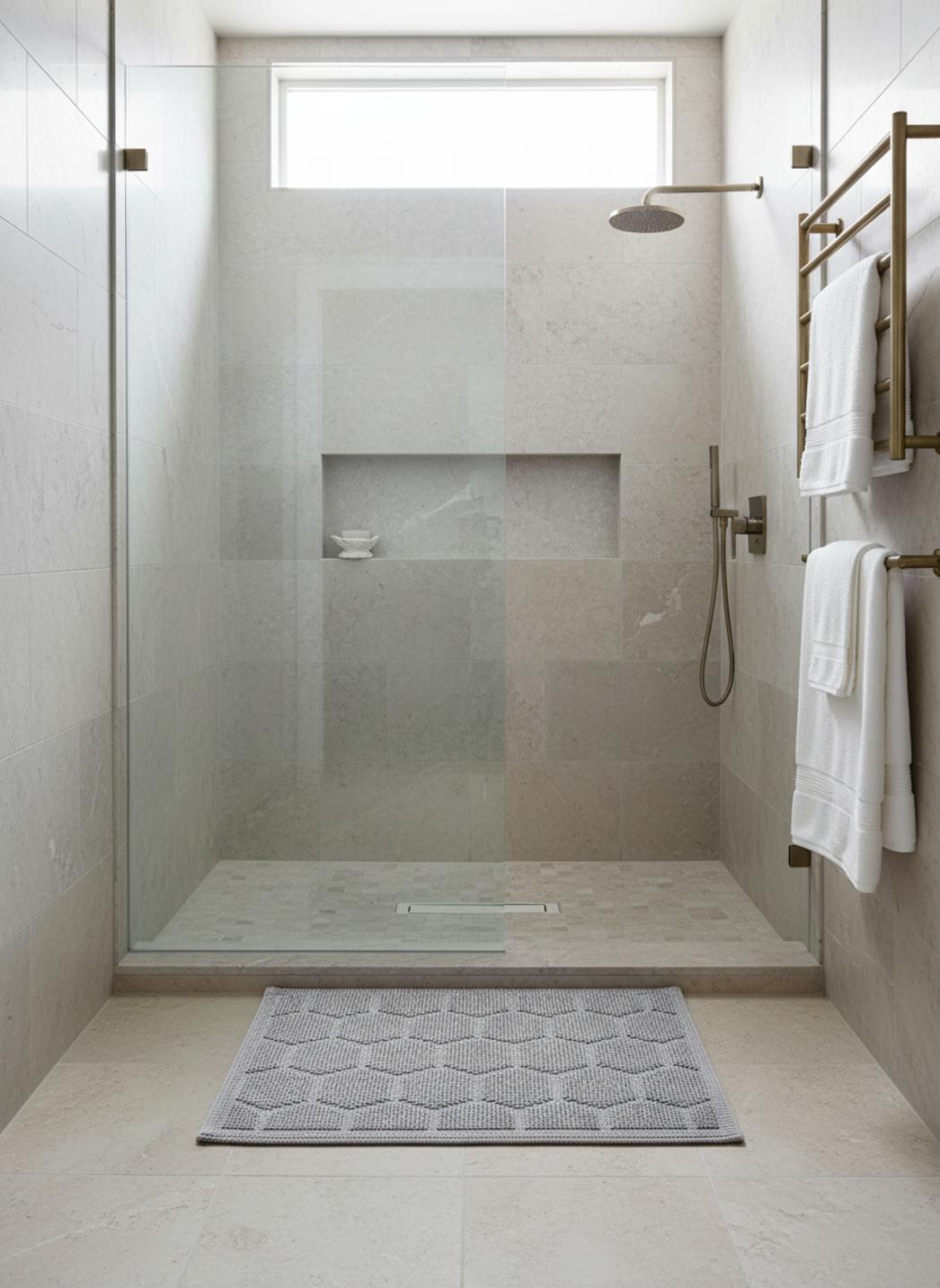 Conçu pour la salle de bain, il s’impose comme un élément de confort quotidien : le dessin géométrique structure la vue tandis que la palette joue la sobriété. Un voile de gris tempère le contraste et ouvre une atmosphère apaisée, facilement accordable aux matériaux contemporains comme le bois clair, le marbre ou les carreaux graphiques.